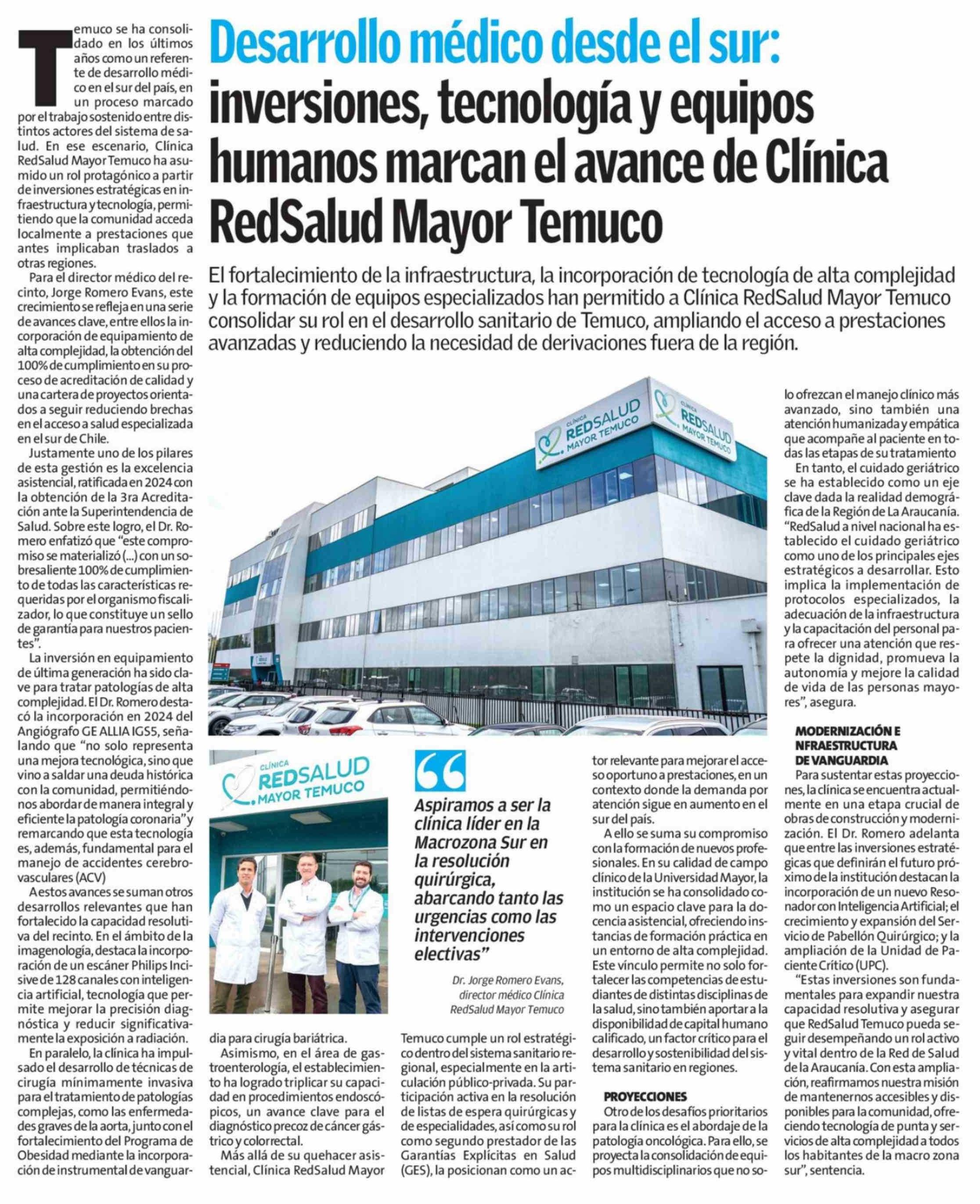 Desarrollo médico desde el sur: inversiones, tecnología y equipos humanos marcan el avance de Clínica RedSalud Mayor Temuco 30-03-2026 El Austral de la Araucanía |