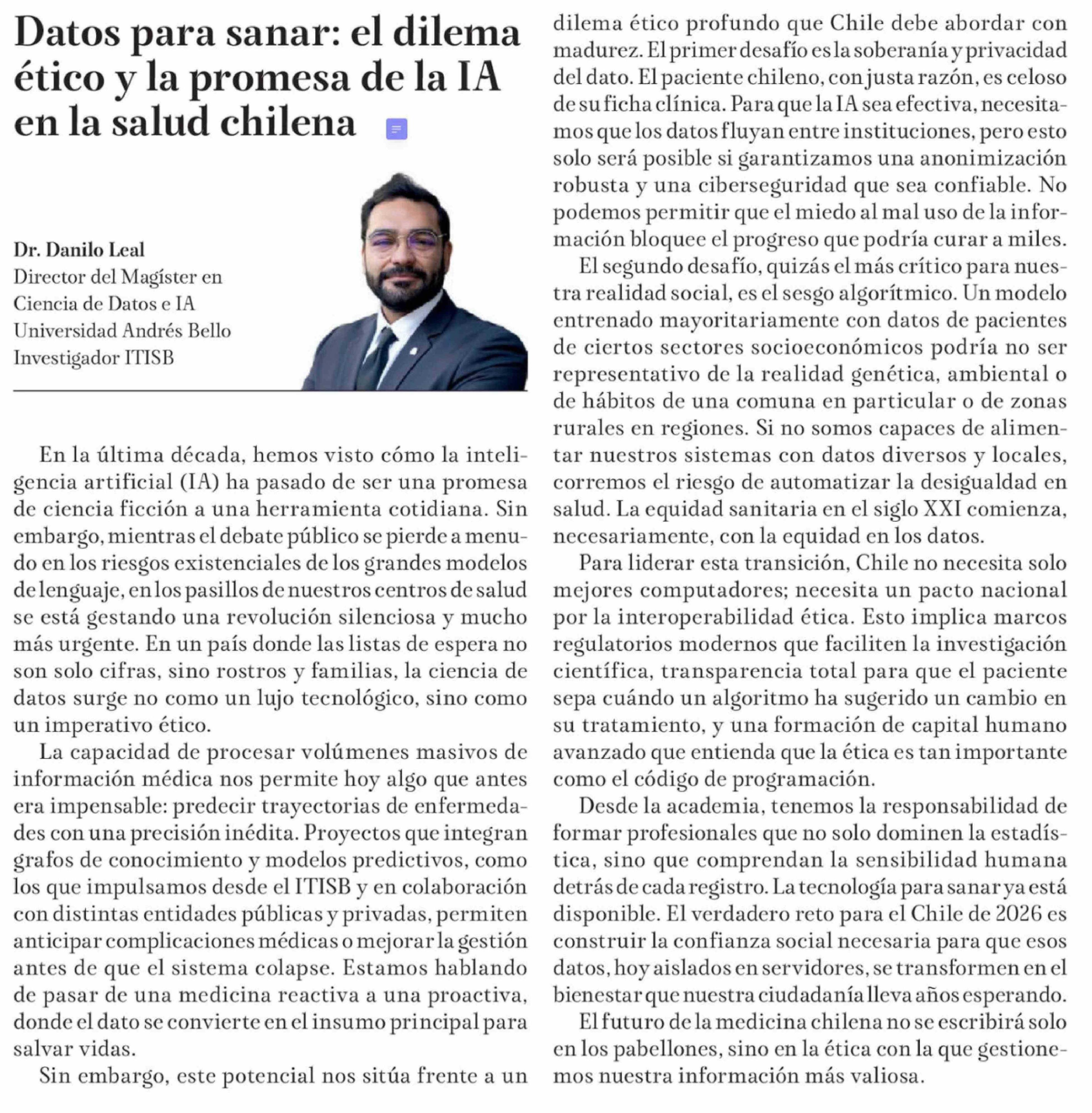 Columnas de Opinión: Datos para sanar: el dilema ético y la promesa de la IA en la salud chilena 11-02-2026 La Tribuna |