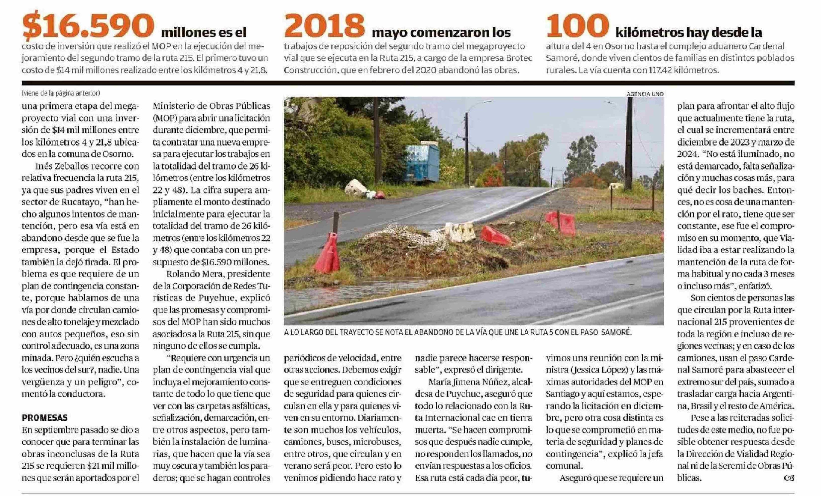 Ruta 215: exigen un plan de contingencia por el pésimo estado de la vía internacional 14-11-2023 El Austral de Osorno |