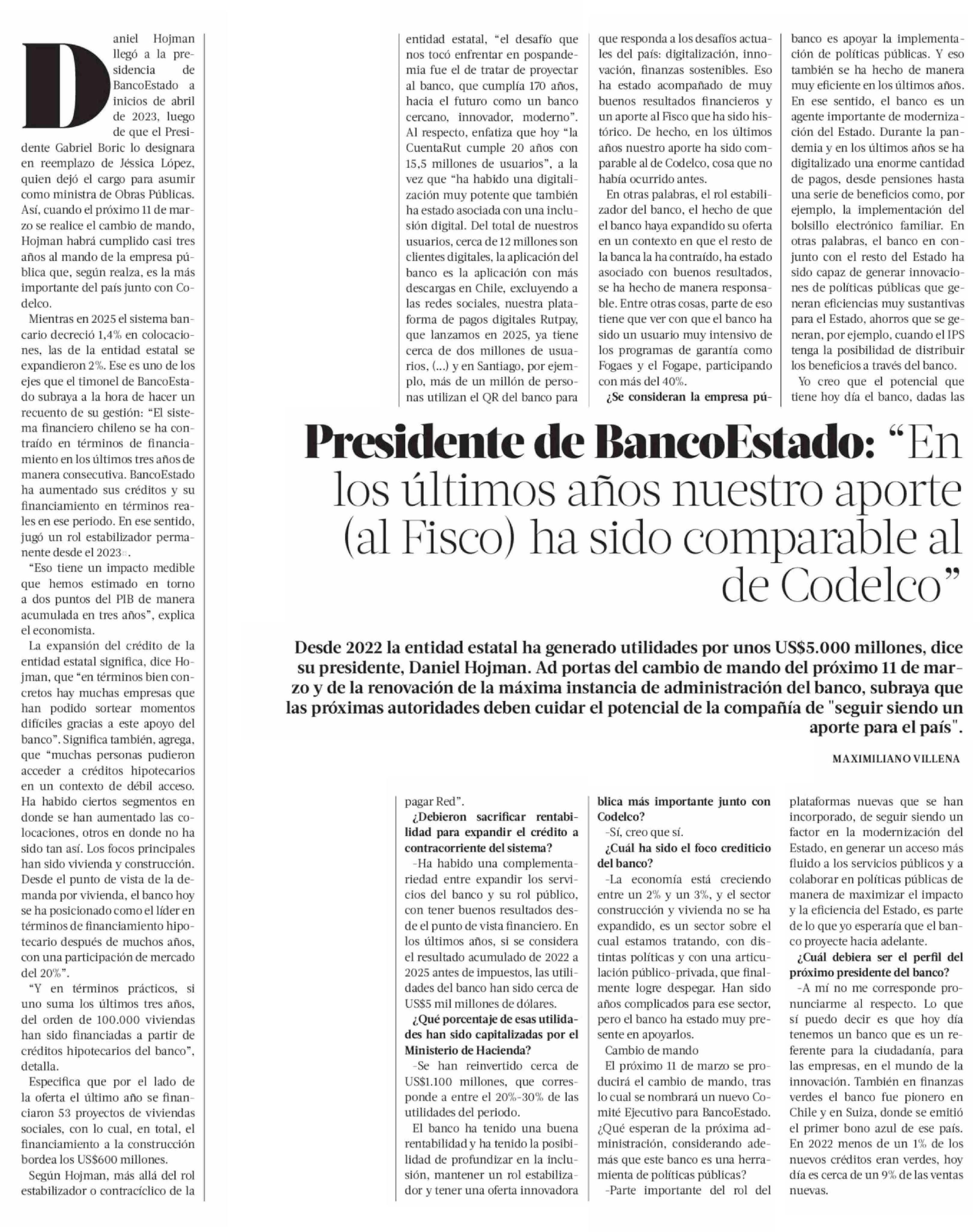 Presidente de Banco Estado: *En los últimos años nuestro aporte (al Fisco) ha sido comparable al de Codelco” 28-02-2026 La Tercera |