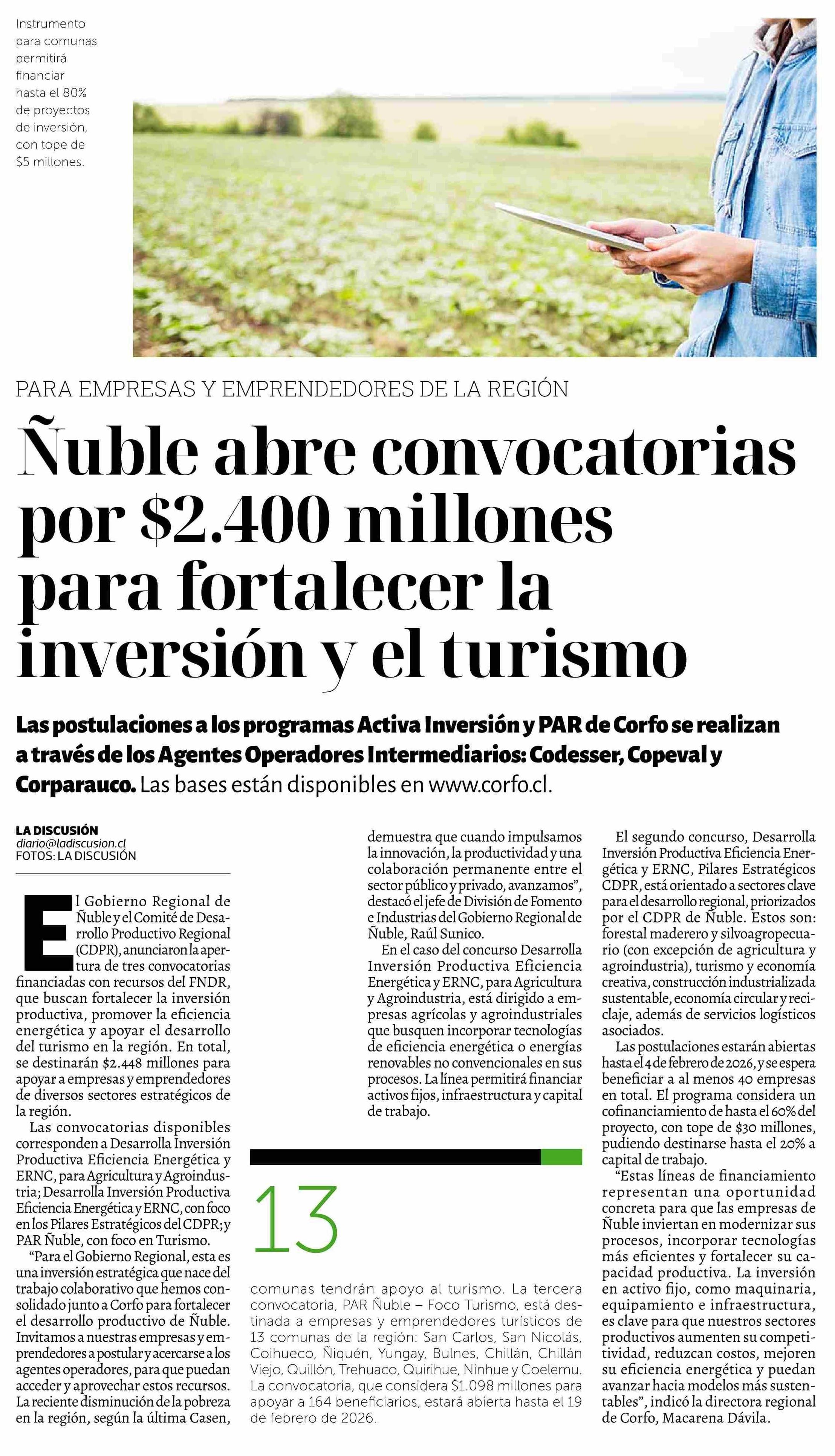 Ñuble abre convocatorias por $2.400 millones para fortalecer la inversión y el turismo 14-01-2026 La Discusión |