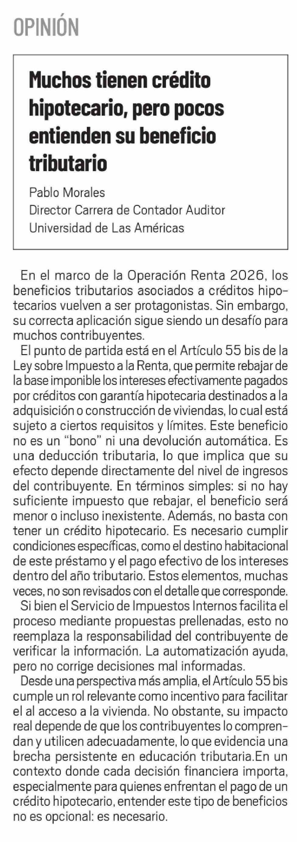 Columnas de Opinión: Muchos tienen crédito hipotecario, pero pocos entienden su beneficio tributario 08-04-2026 El Día |