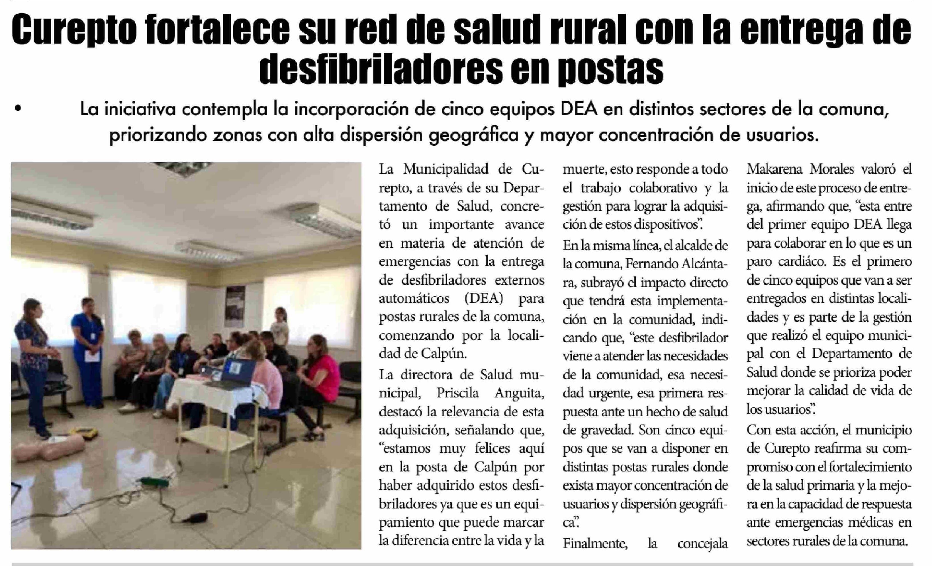 | Título: | Curepto fortalece su red de salud rural con la entrega de desfibriladores en postas |