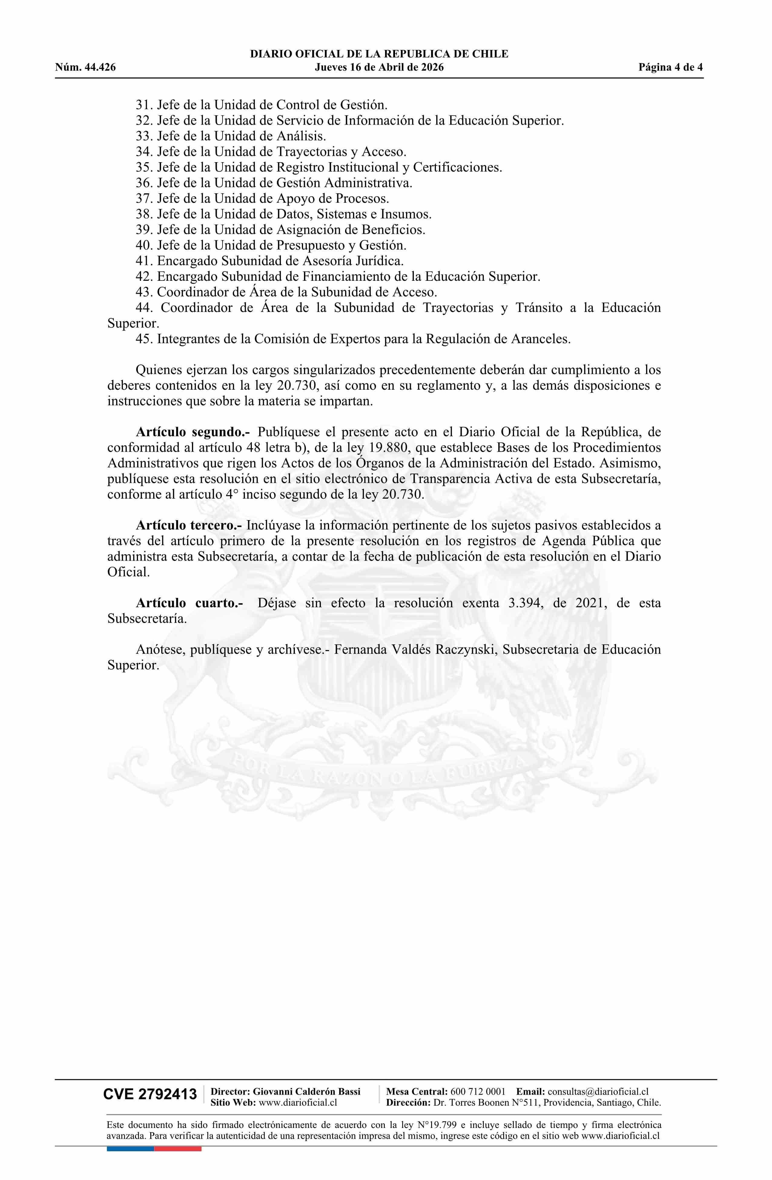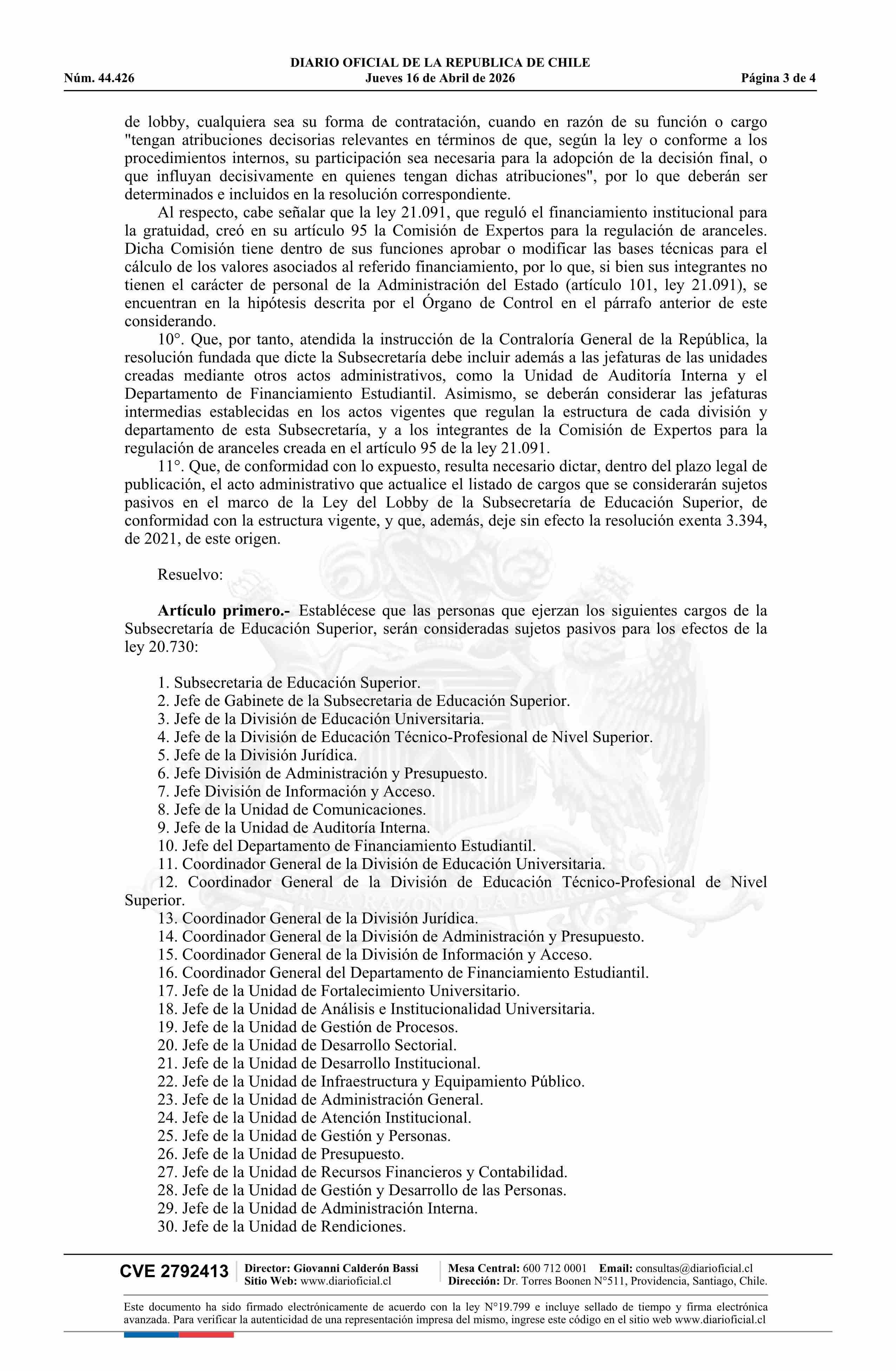 Resolución exenta número 1.630, de 2026.- Establece listado de cargos considerados sujetos pasivos de lobby o gestión de intereses particulares, conforme a la ley N° 20.730, y deja sin efecto resolución N° 3.394 exenta, de 2021