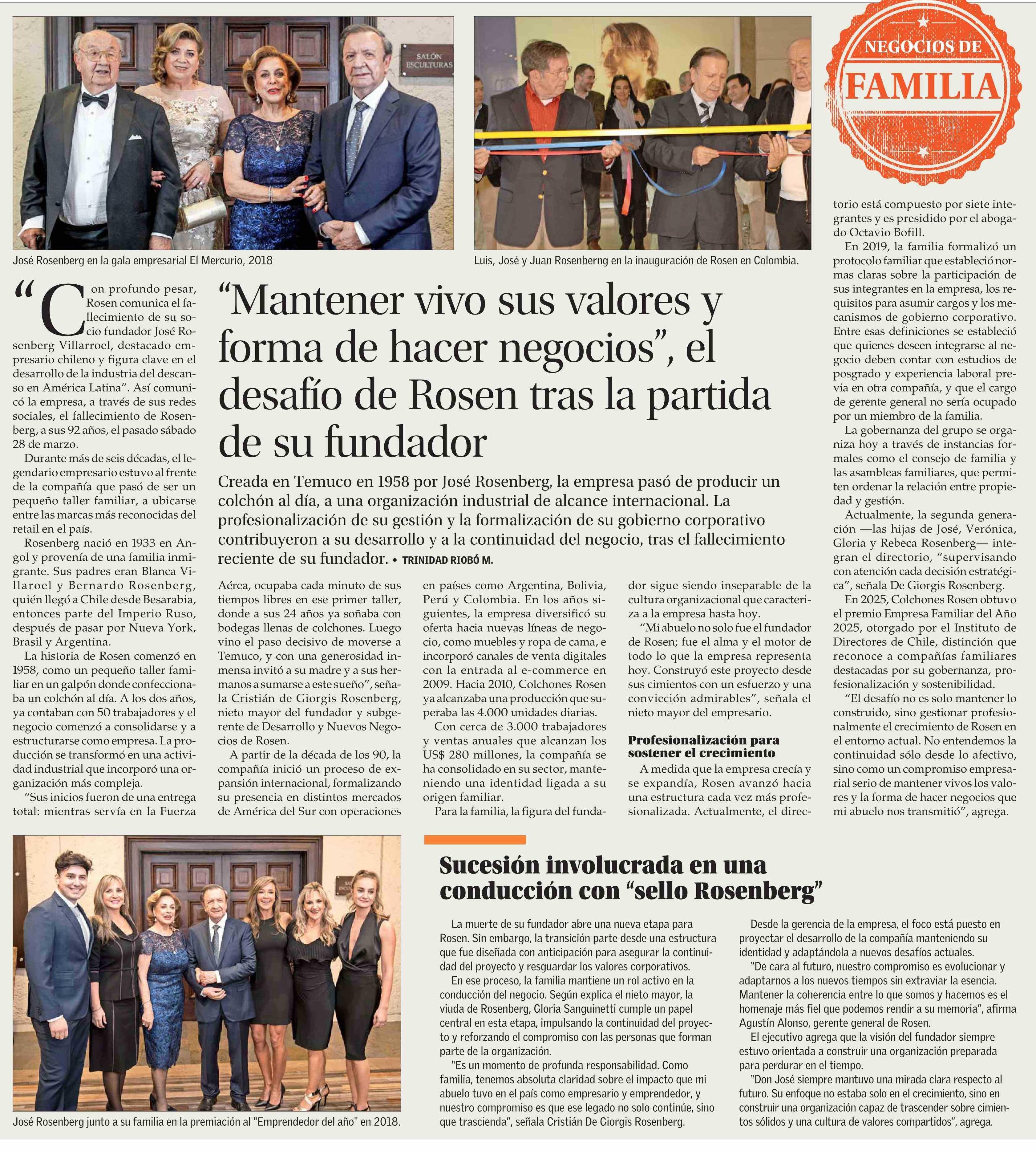 “Mantener vivo sus valores y forma de hacer negocios”, el desafío de Rosen tras la partida de su fundador 05-04-2026 El Mercurio |