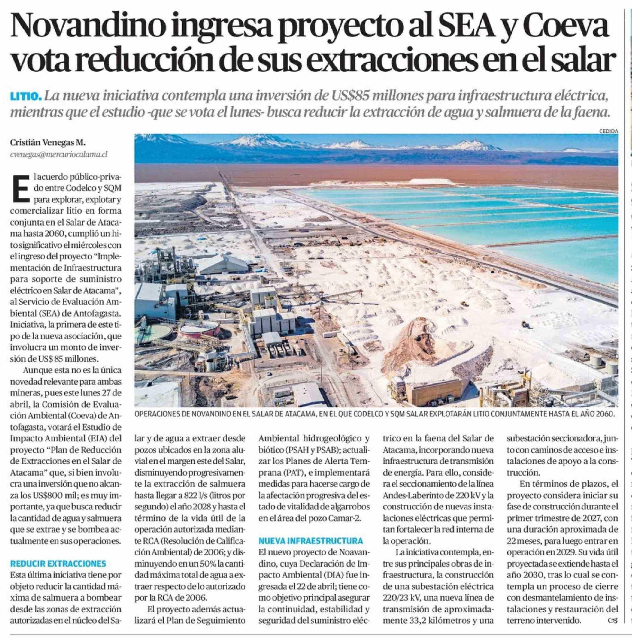 Novandino ingresa proyecto al SEA y Coeva vota reducción de sus extracciones en el salar 24-04-2026 El Mercurio de Antofagasta |