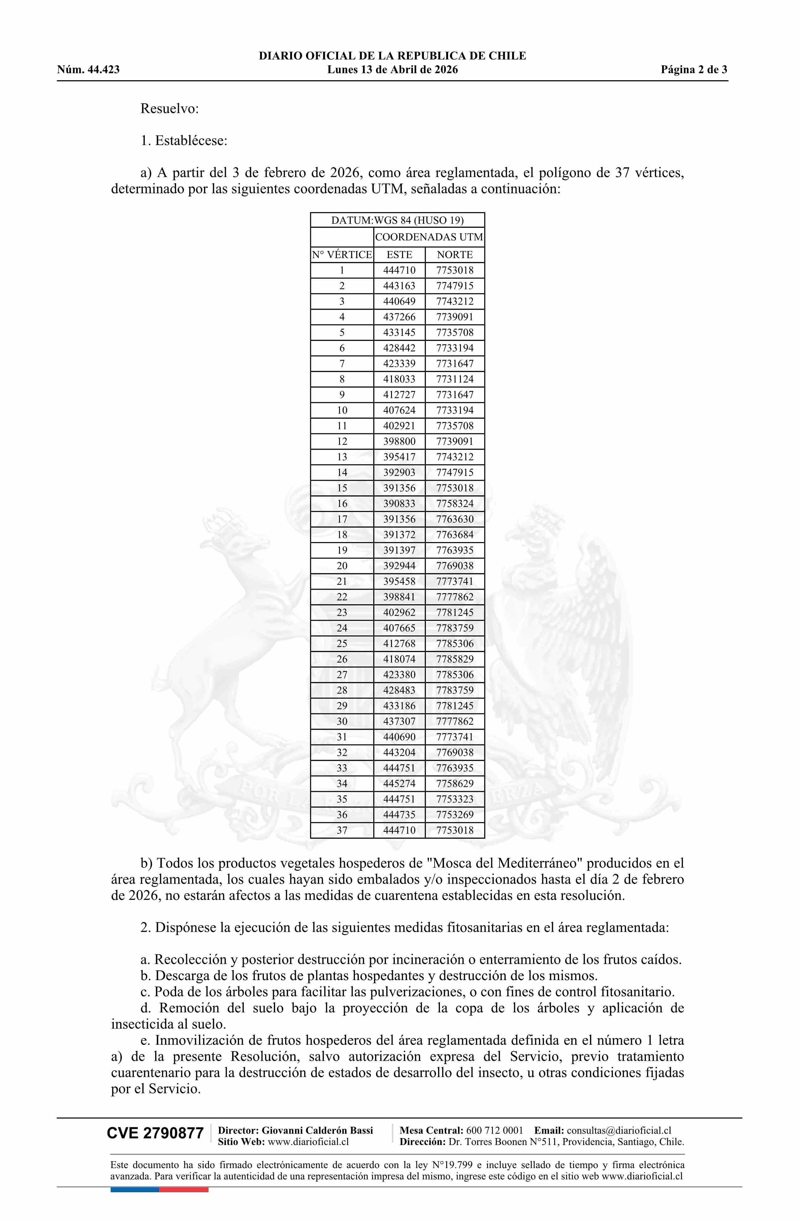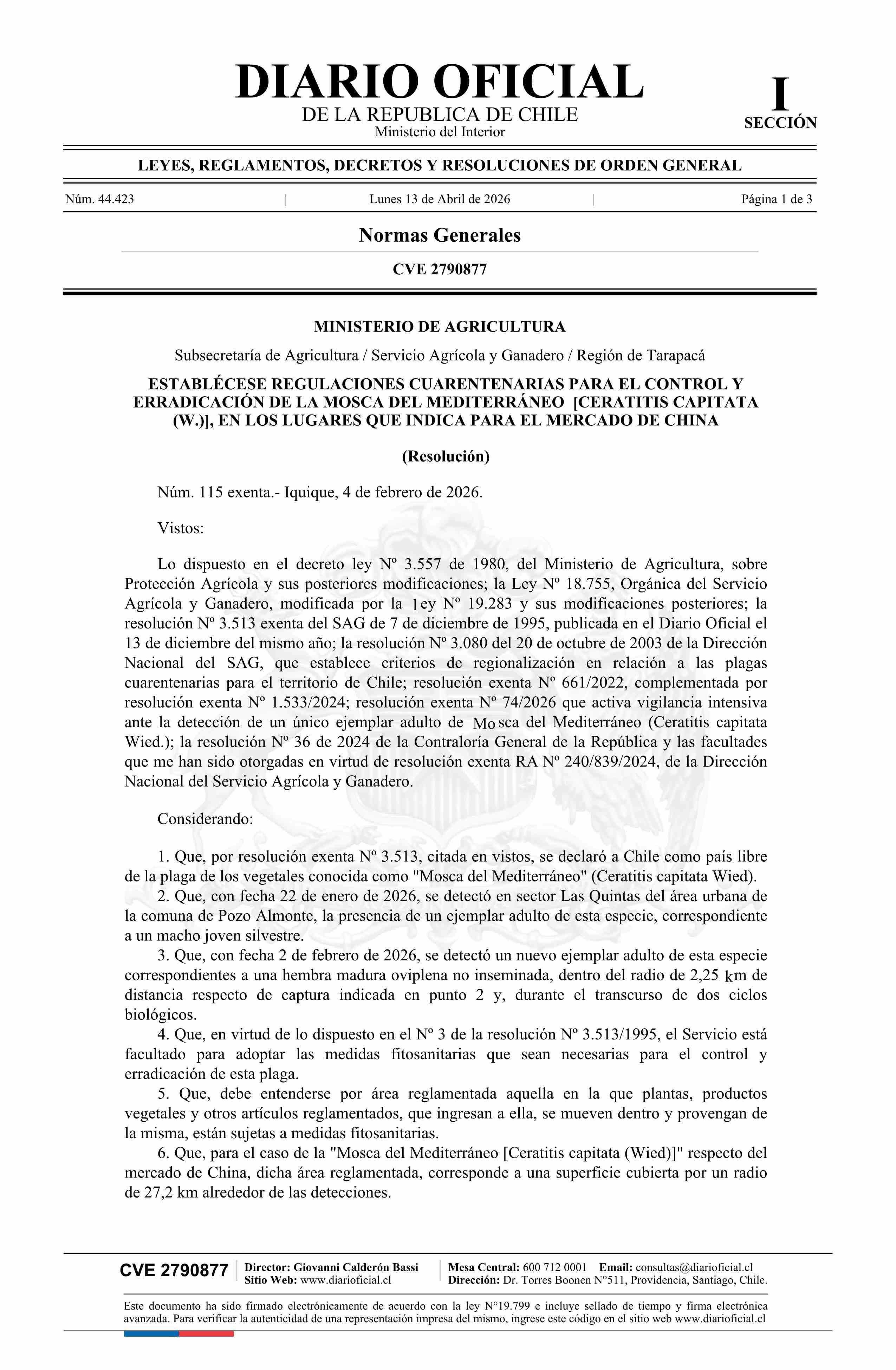Título: Resolución exenta número 115, de 2026.- Establece regulaciones cuarentenarias para el control y erradicación de la Mosca del Mediterráneo (Ceratitis capitata W.), en los lugares que indica para el mercado de China