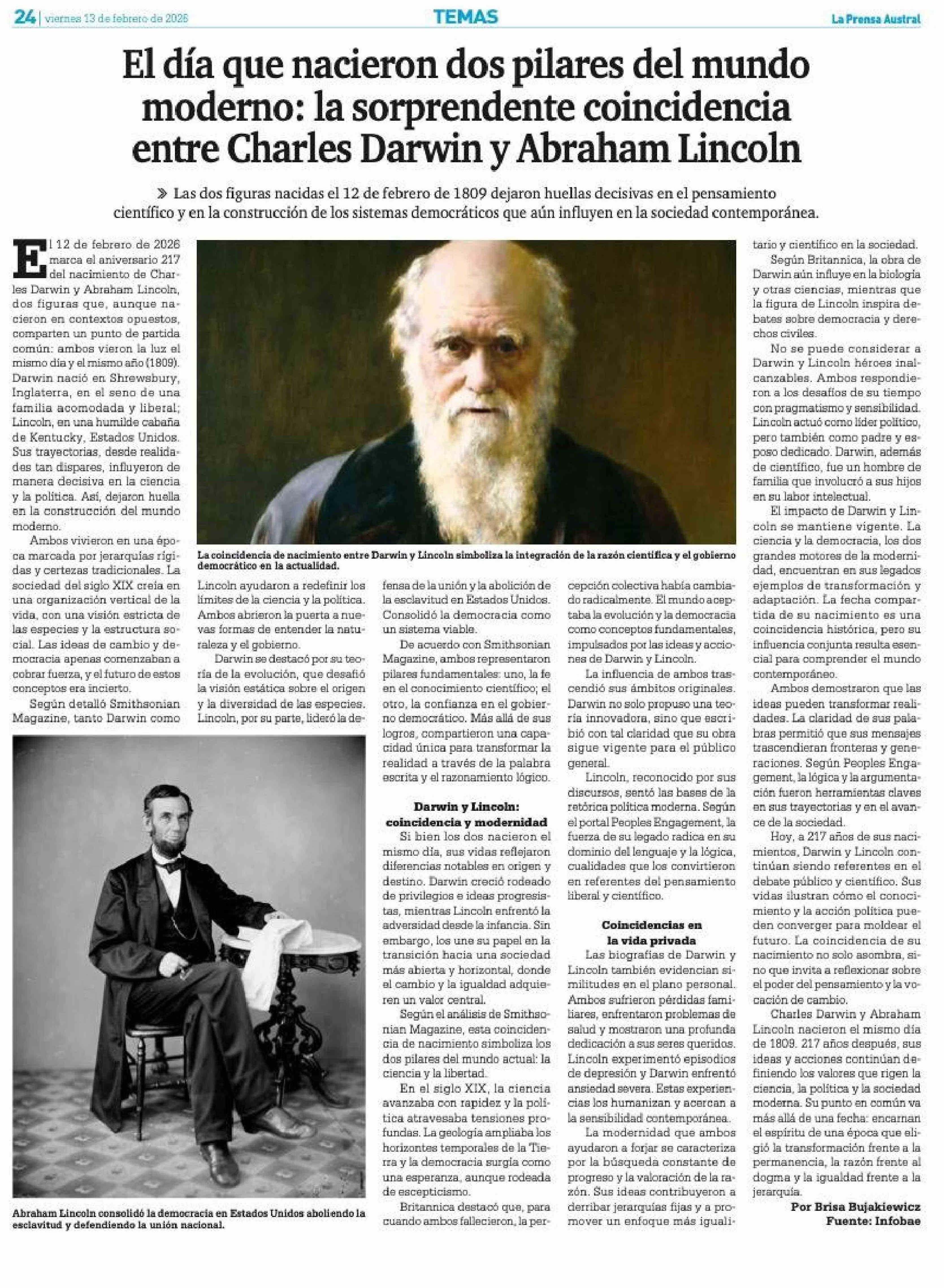 El día que nacieron dos pilares del mundo moderno: la sorprendente coincidencia entre Charles Darwin y Abraham Lincoln 13-02-2026 La Prensa Austral |