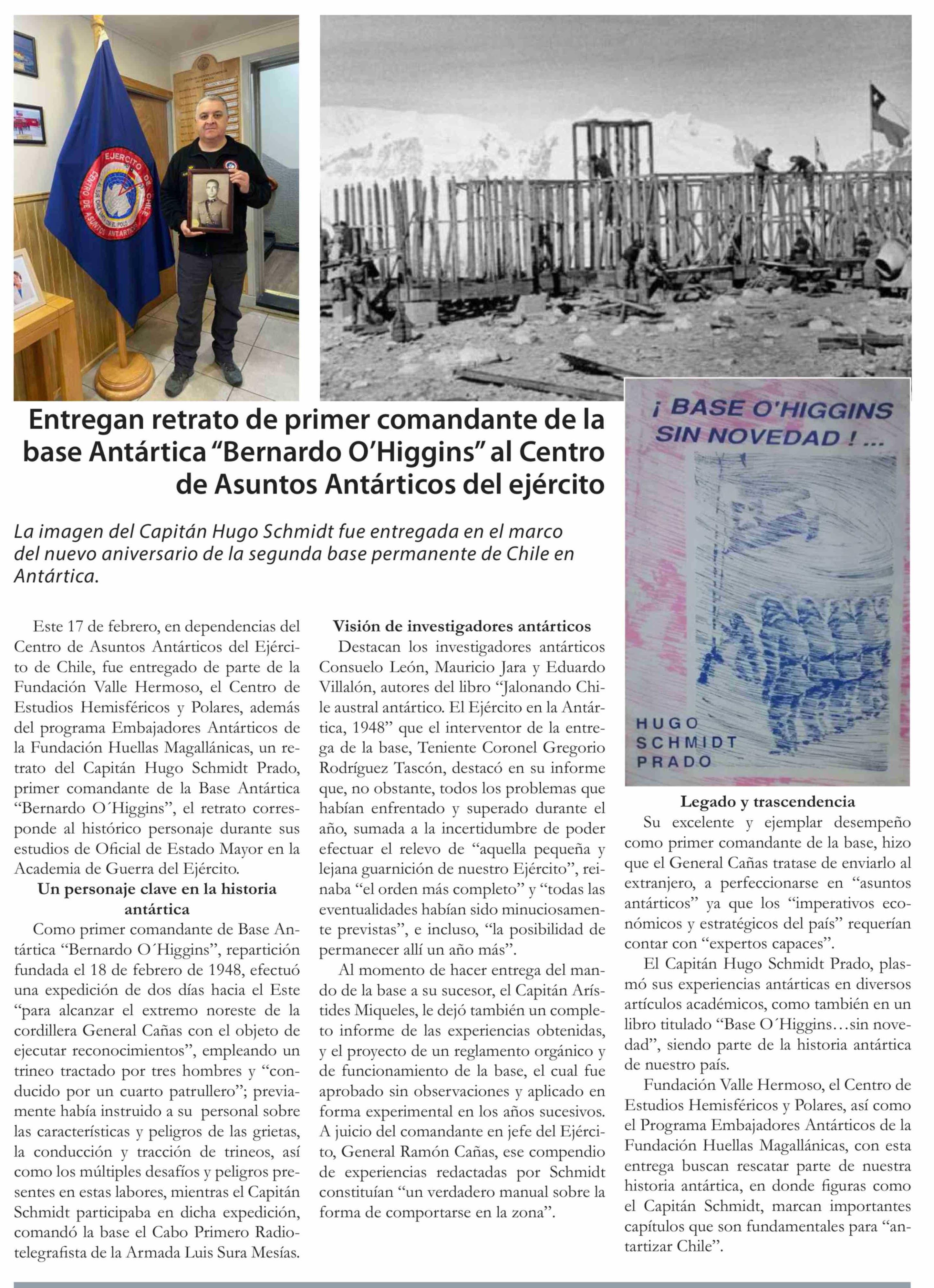 Entregan retrato de primer comandante de la base Antártica "Bernardo O'Higgins" al Centro de Asuntos Antárticos del ejército 18-02-2026 El Divisadero |
