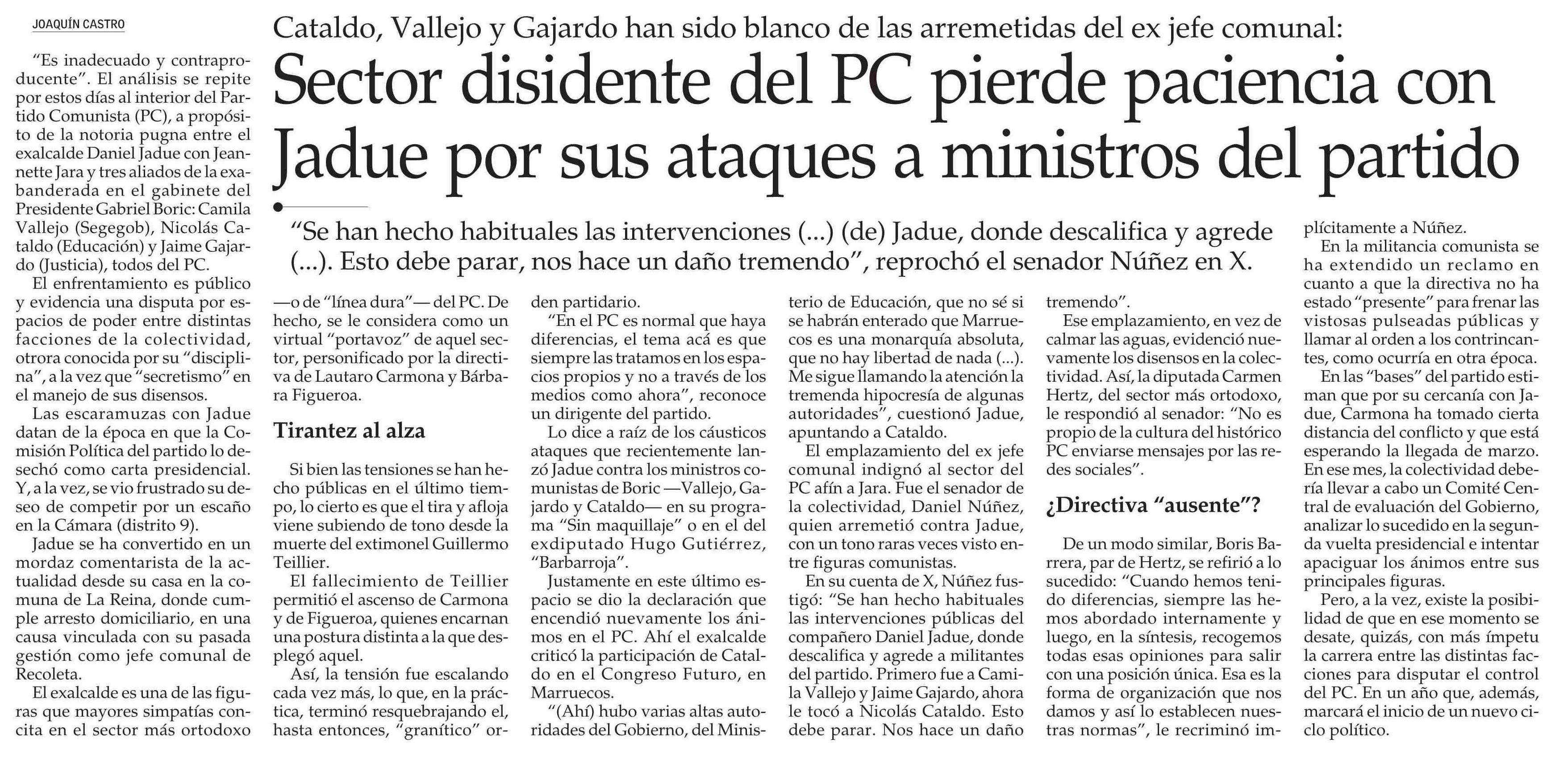 Título: Sector disidente del PC pierde paciencia con Jadue por sus ataques a ministros del partido
