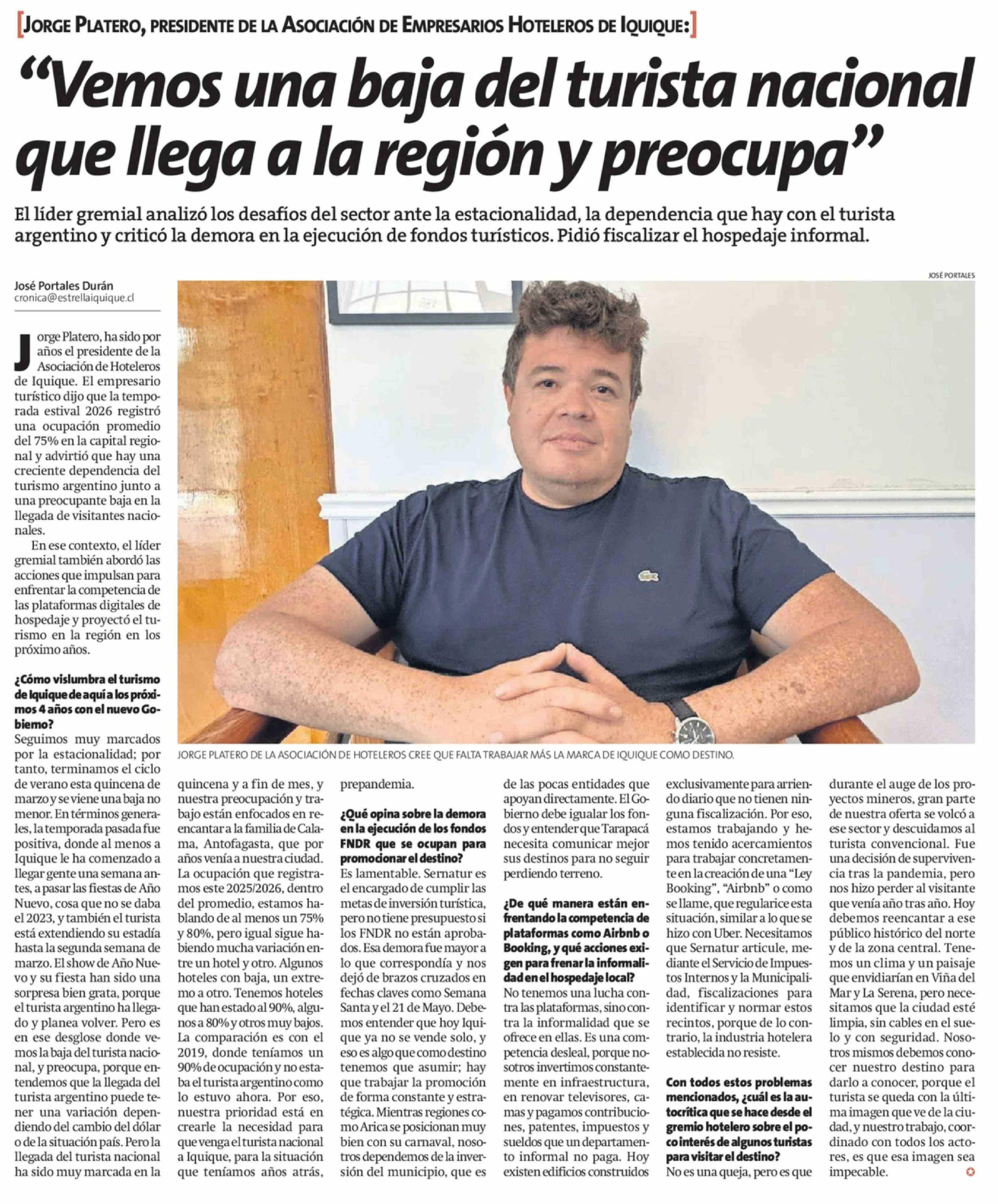 "Vemos una baja del turista nacional que llega a la región y preocupa" 22-03-2026 La Estrella de Iquique |