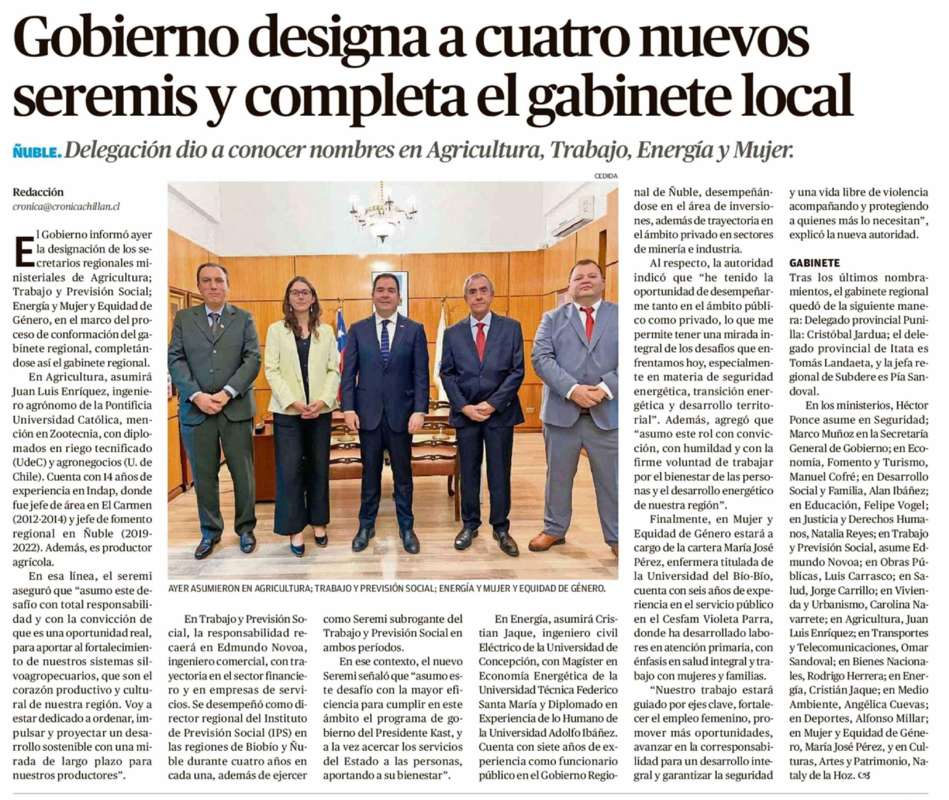 Gobierno designa a cuatro nuevos seremis y completa el gabinete local 01-04-2026 Crónica de Chillán |