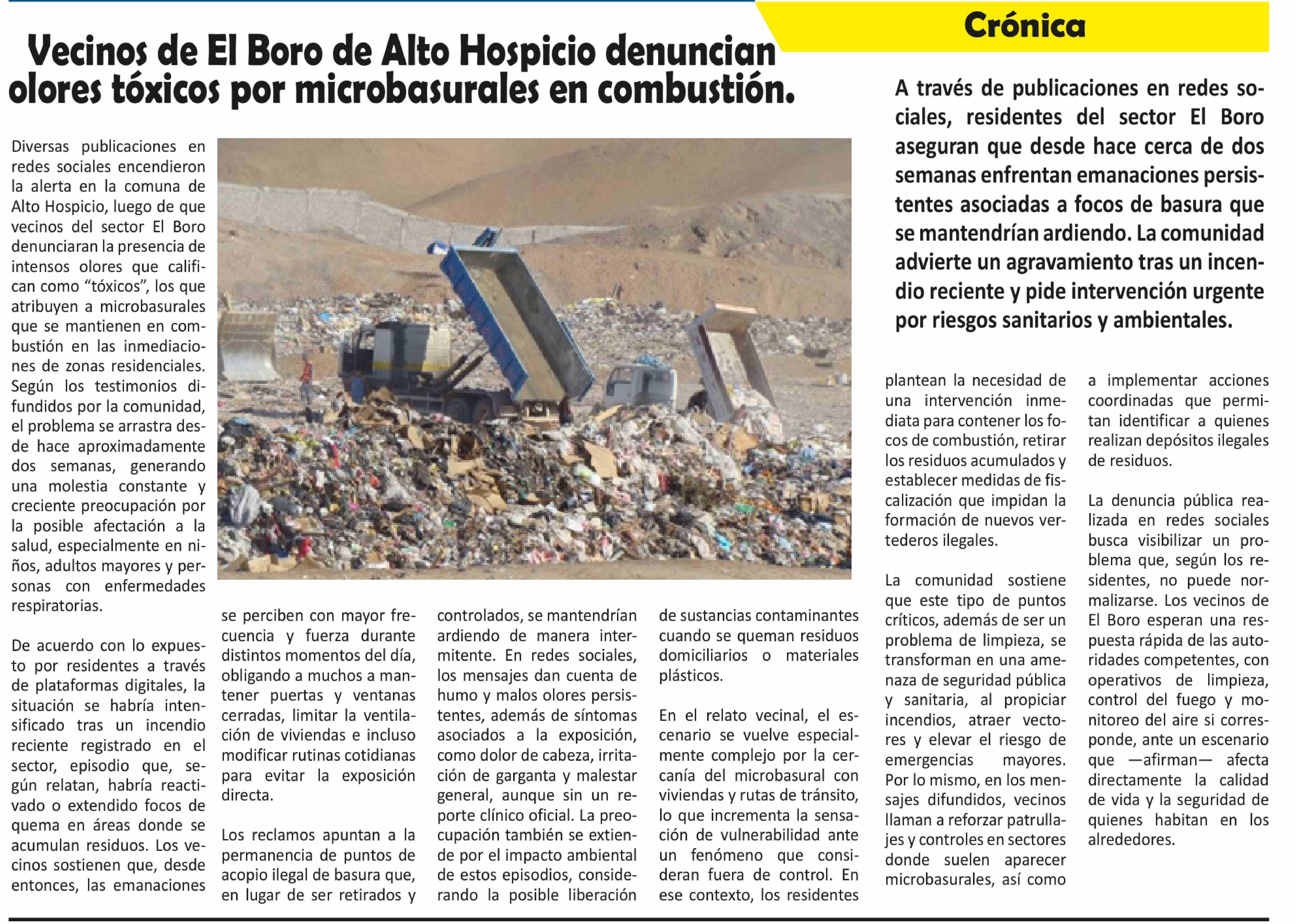 | Título: | Vecinos de El Boro de Alto Hospicio denuncian olores tóxicos por microbasurales en combustión. |