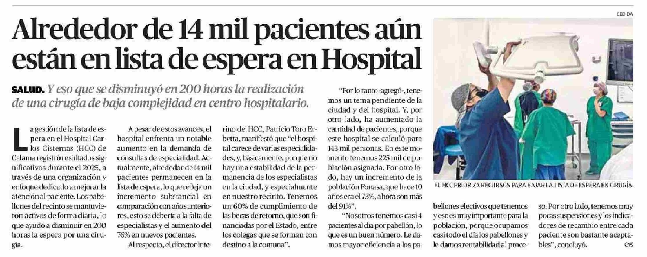 Alrededor de 14 mil pacientes aún están en lista de espera en Hospital 11-01-2026 El Mercurio de Calama |