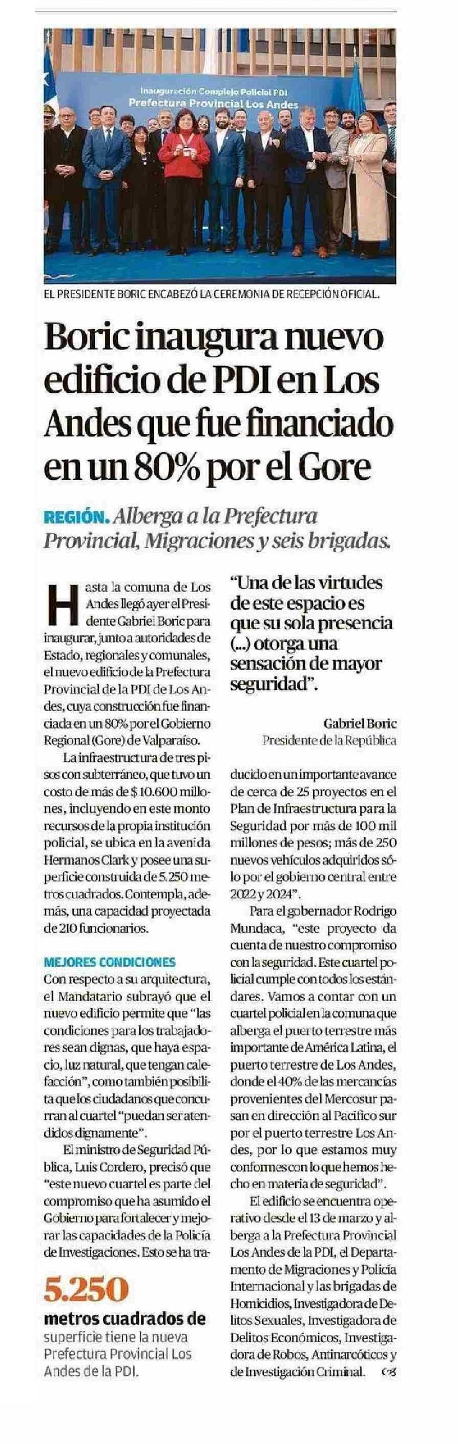 Boric inaugura nuevo edificio de PDIen Los Andes que fue financiado en un 80% por el Gore 05-06-2025 El Mercurio de Valparaíso |