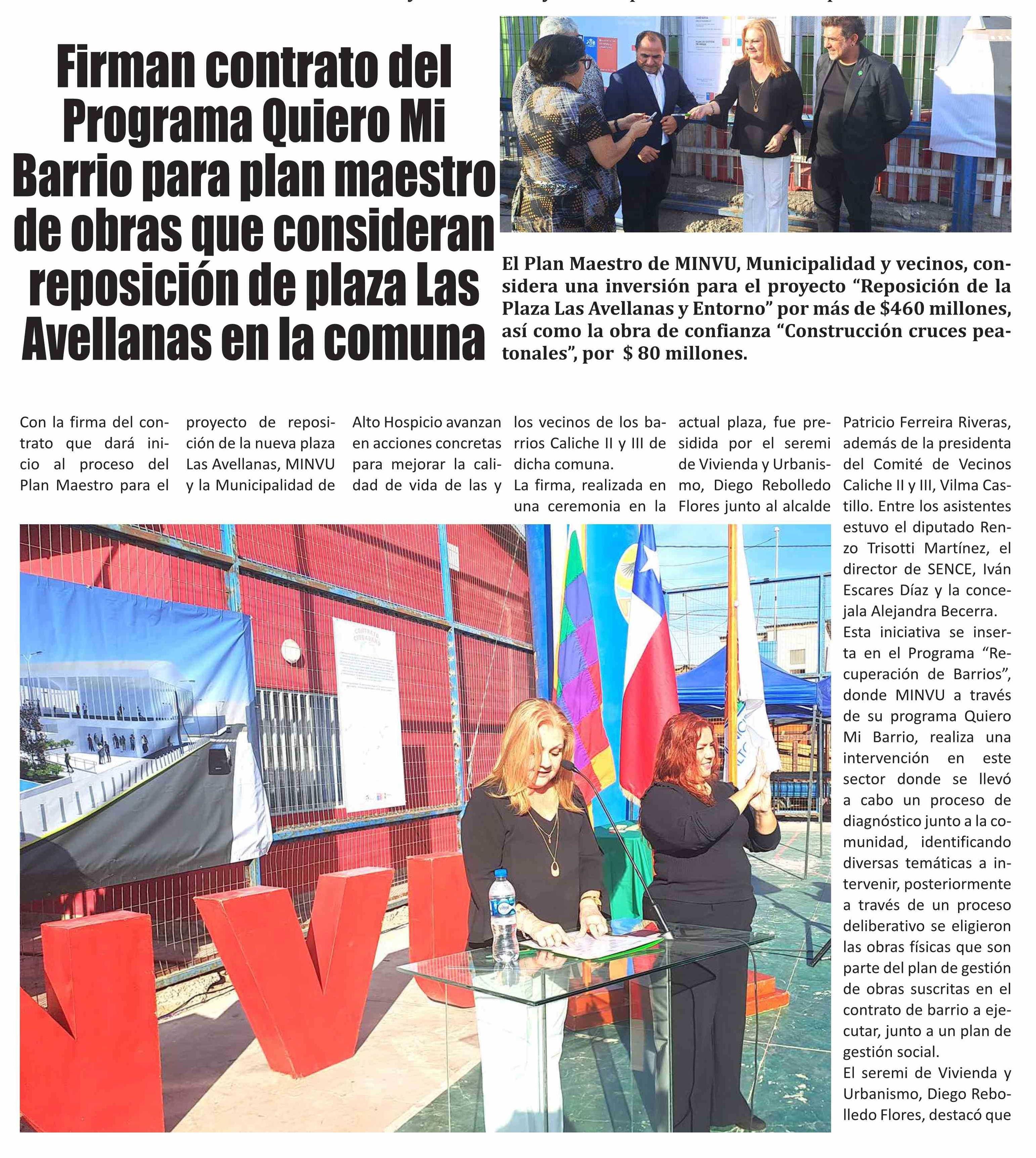 | Título: | Firman contrato del Programa Quiero Mi Barrio para plan maestro de obras que consideran reposición de plaza Las Avellanas en la comuna |