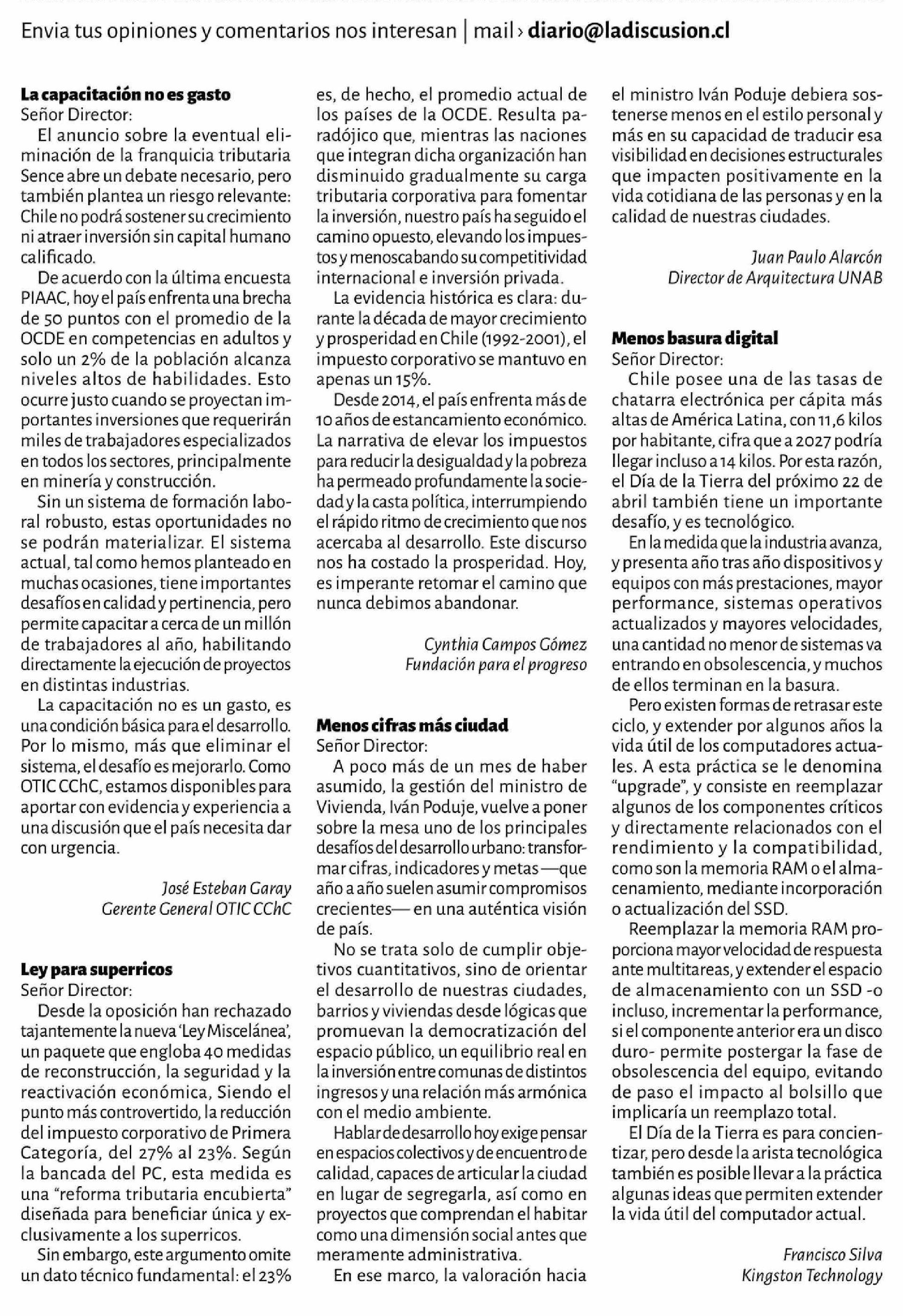| Título: | La capacitación no es gasto Señor Director: El anuncio sobre la eventual eliminación de la franquicia tributaria Sence abre un debate necesario, pero también plantea un riesgo relevante: Chile no podrá sostener su crecimiento ni atraer inversión sin capital humano calificado. De acuerdo con la últim |