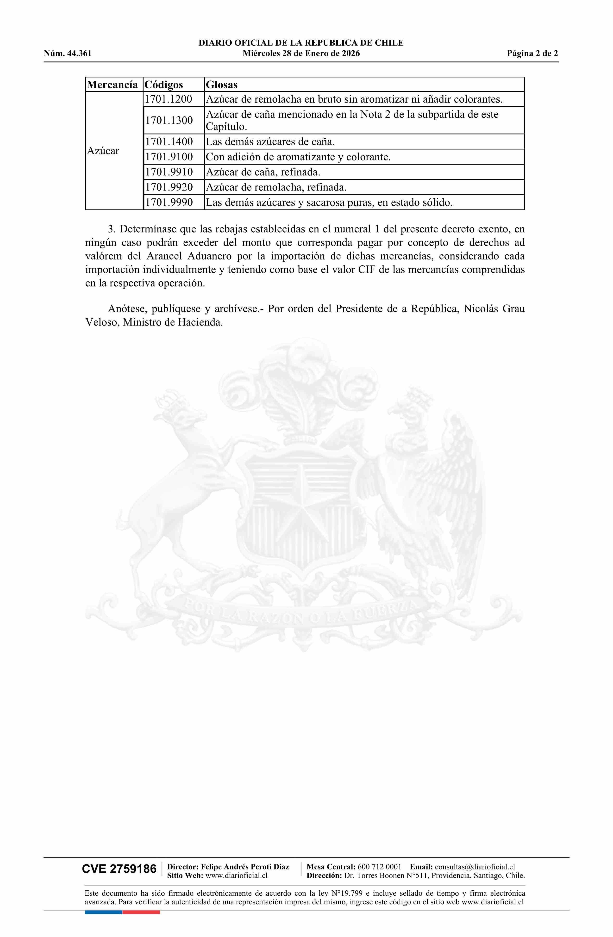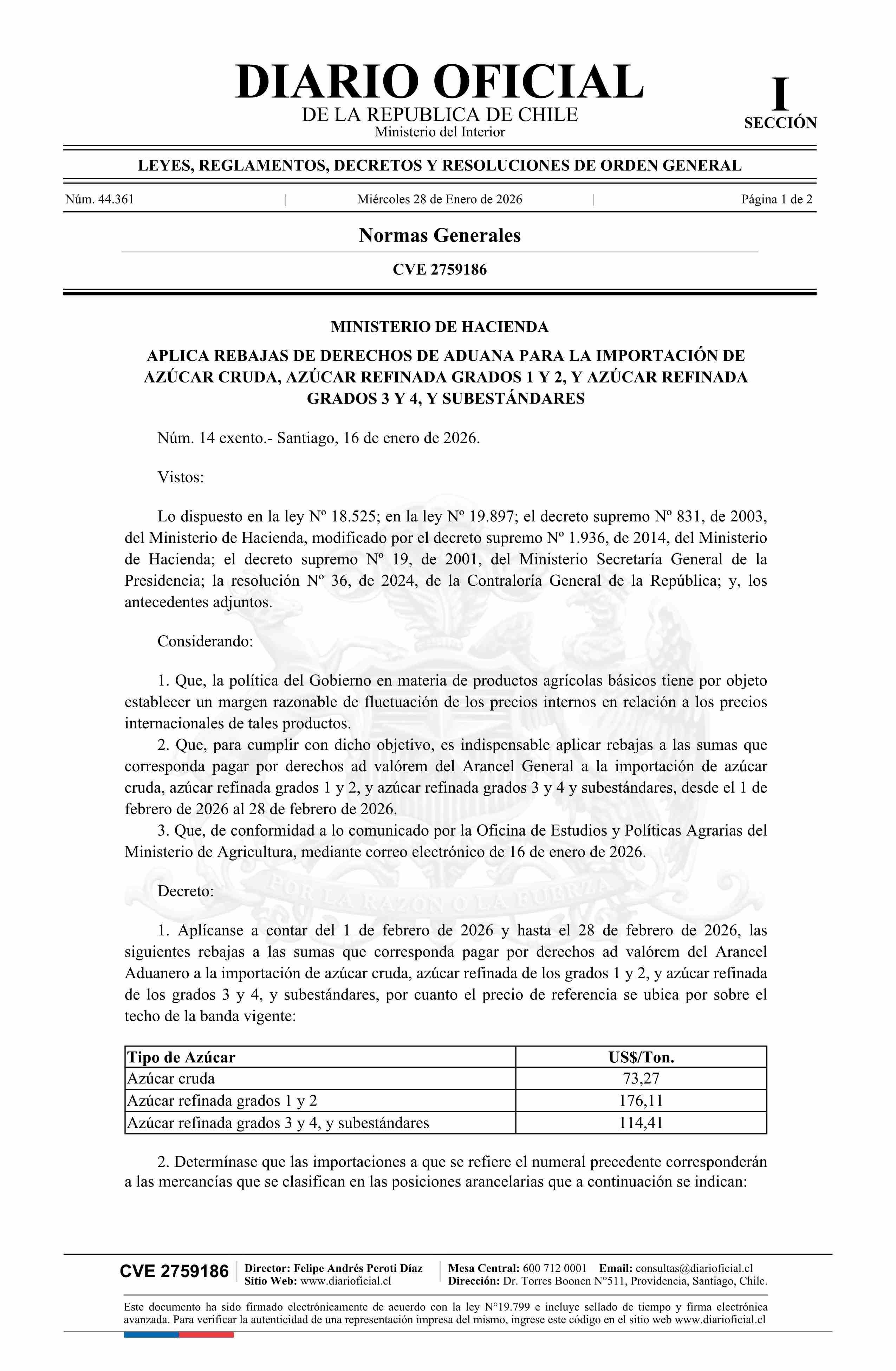 | Título: | Decreto exento número 14, de 2026.- Aplica rebajas de derechos de aduana para la importación de azúcar cruda, azúcar refinada grados 1 y 2, y azúcar refinada grados 3 y 4, y subestándares |