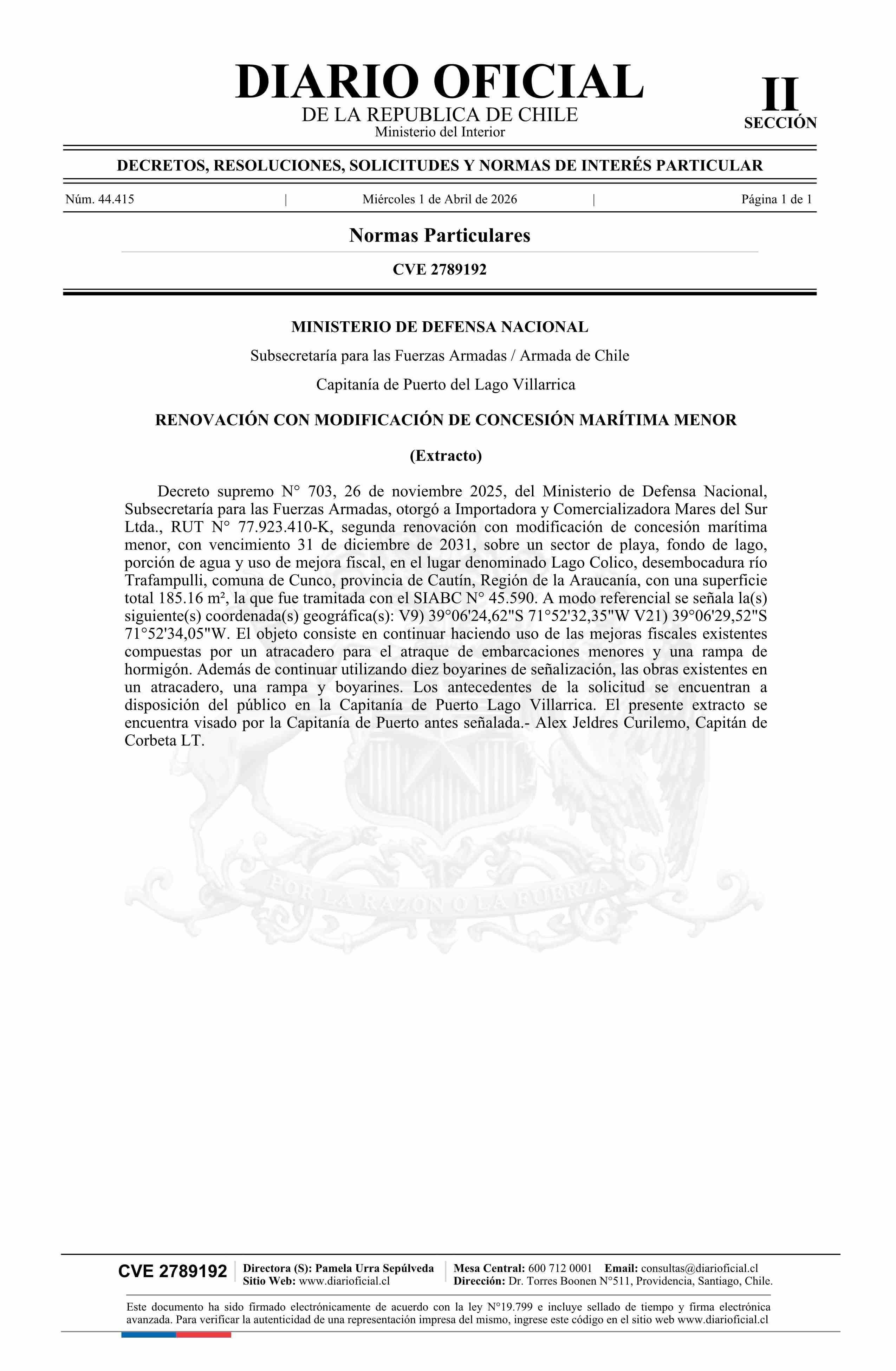 Extracto de decreto número 703, de 2025.- Renovación con modificación de concesión marítima menor 01-04-2026 Diario Oficial Edición Electrónica |