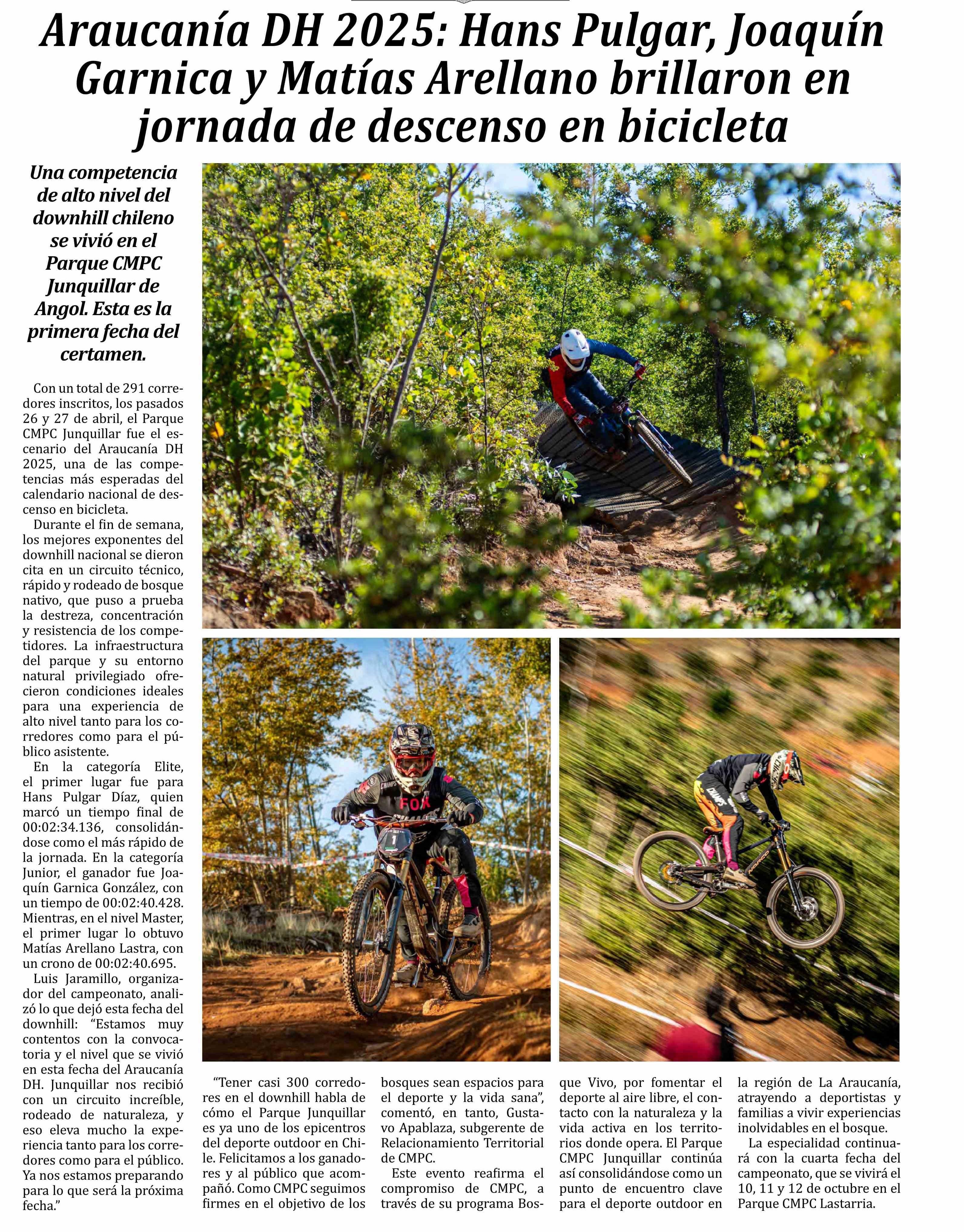 | Título: | Araucanía DH 2025: Hans Pulgar, Joaquín Garnica y Matías Arellano brillaron en jornada de descenso en bicicleta |