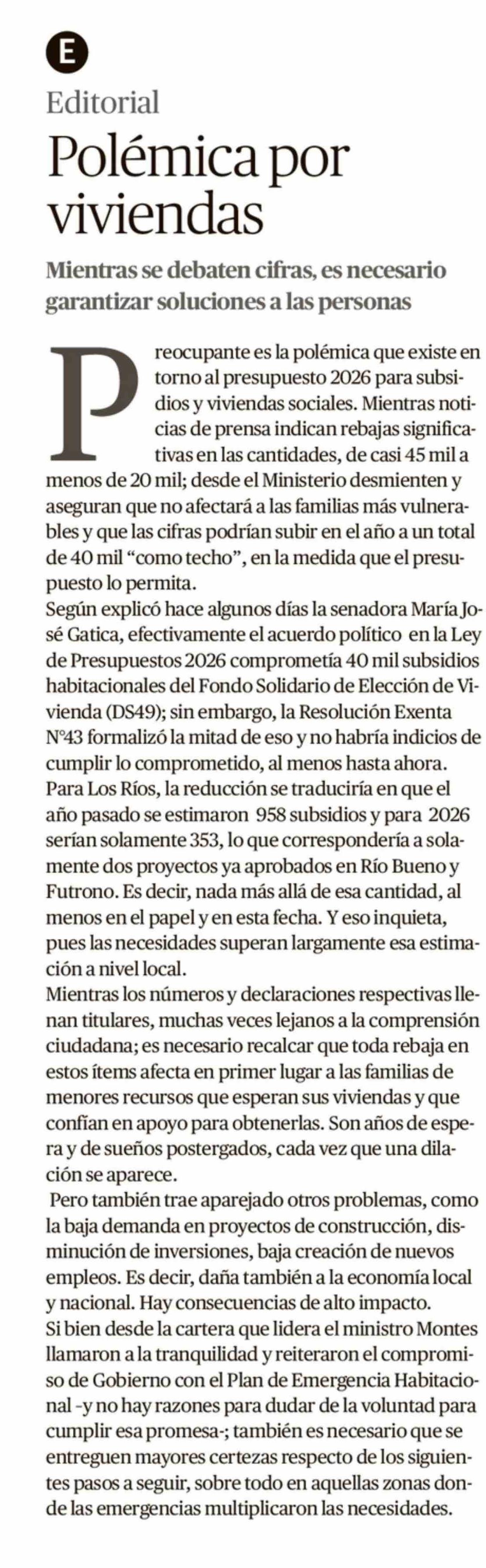 EDITORIAL: Polémica por viviendas 13-02-2026 Diario Austral Región de Los Ríos |