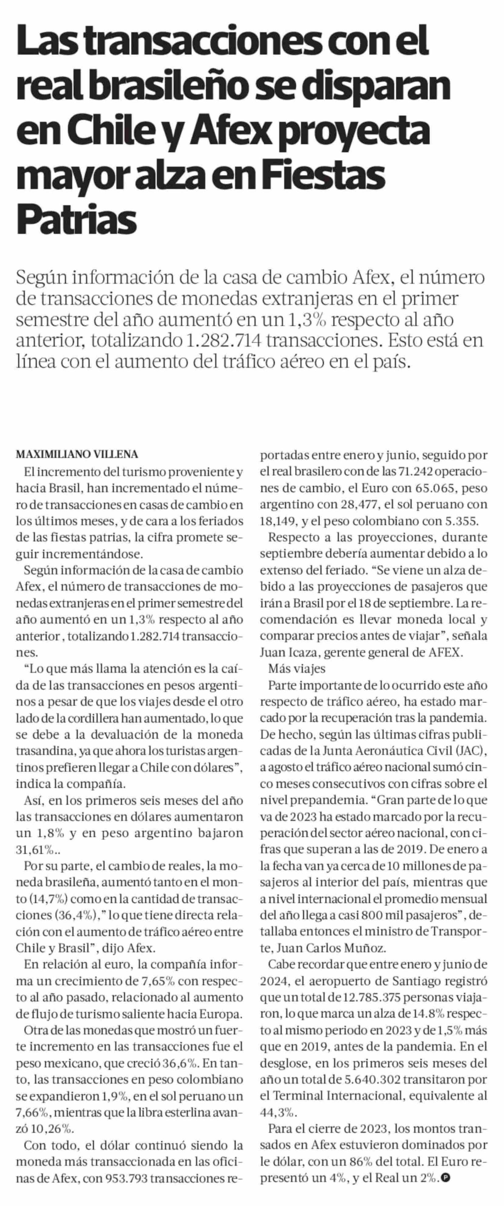 Las transacciones con el real brasileño se disparan en Chile y Afex proyecta mayor alza en Fiestas Patrias 13-09-2024 La Tercera |