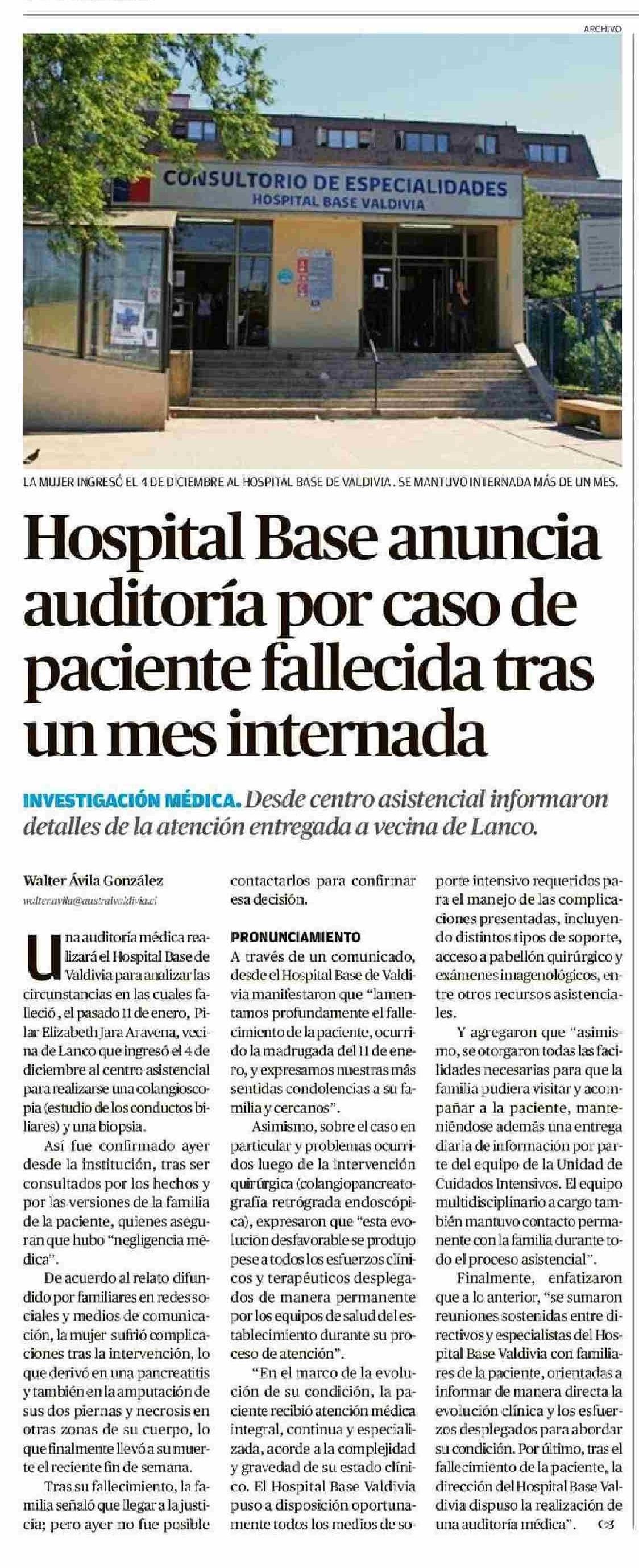 Título: Hospital Base anuncia auditoría por caso de paciente fallecida tras un mes internada