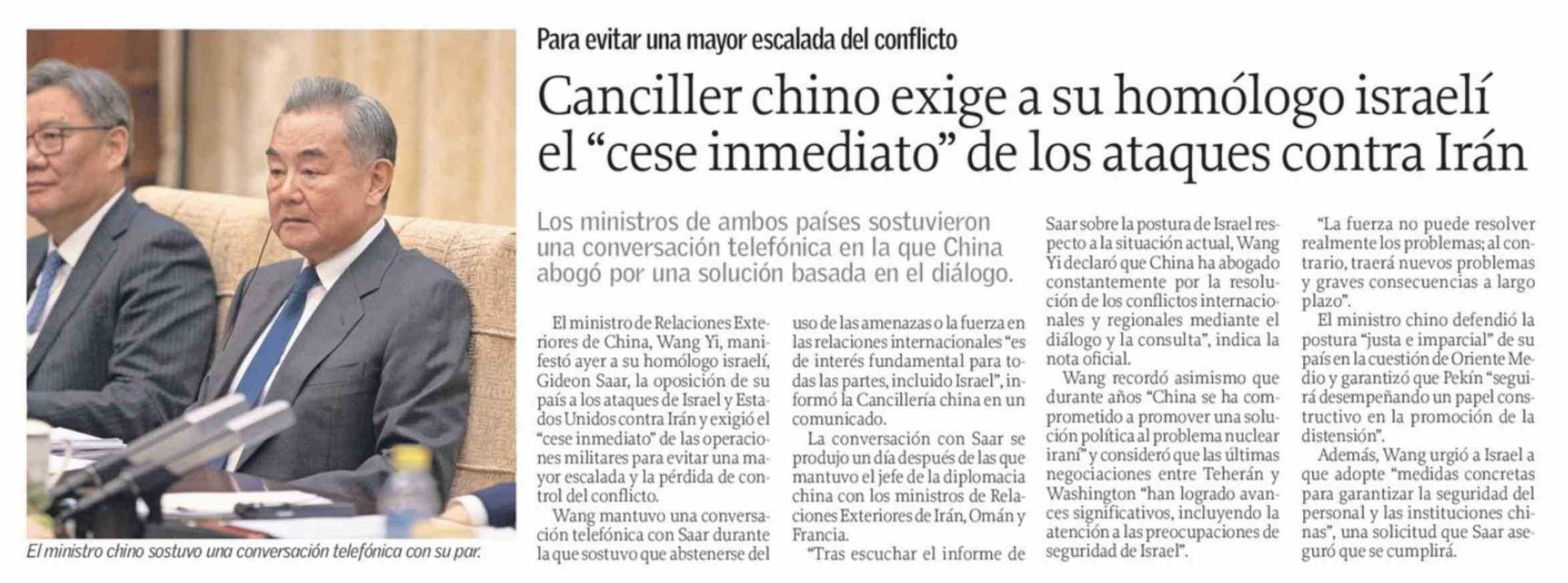 Título: Canciller chino exige a su homólogo israelí el "cese inmediato" de los ataques contra Irán