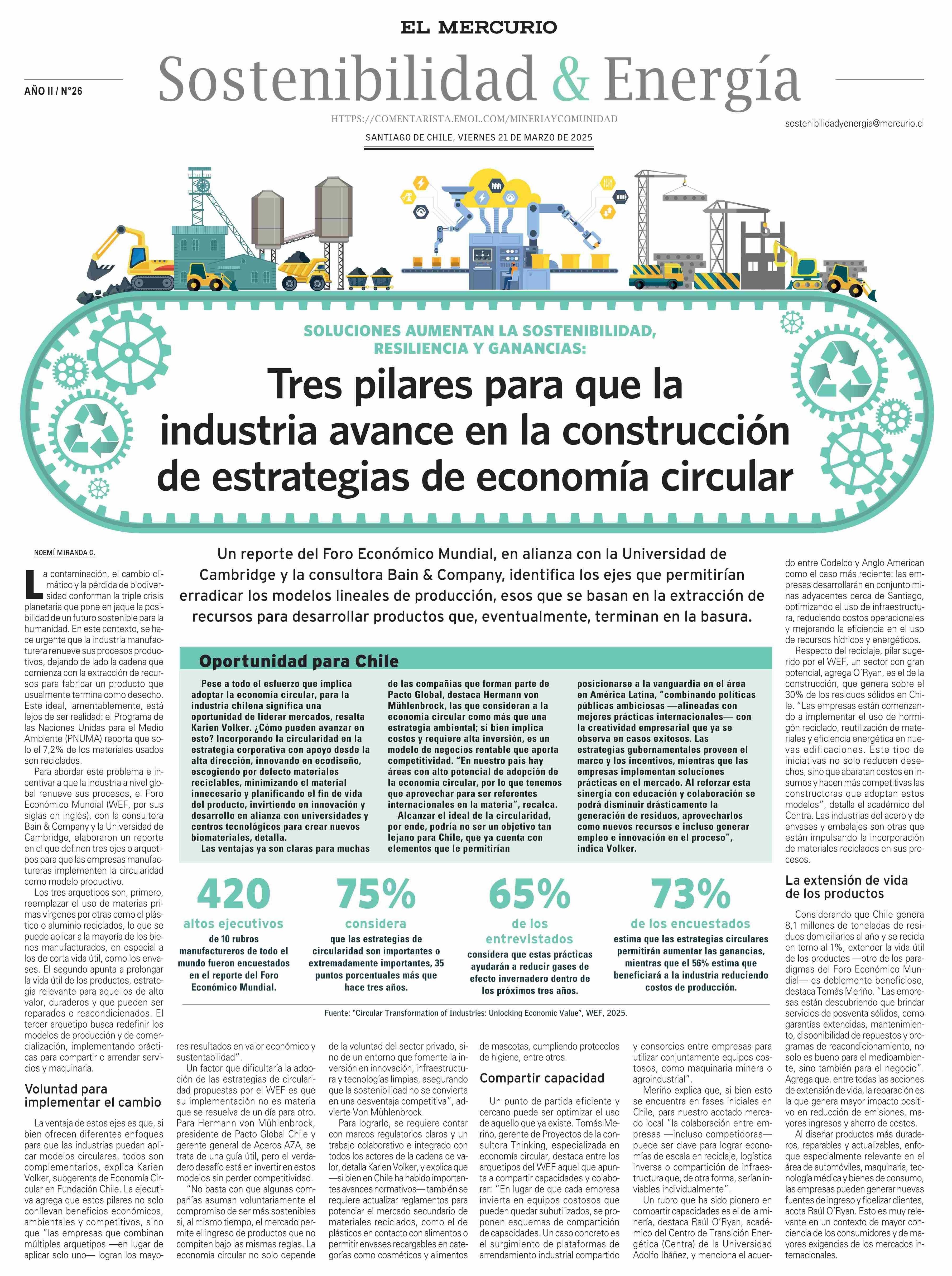 Tres pilares para que la industria avance en la construcción de estrategias de economía circular 21-03-2025 El Mercurio |