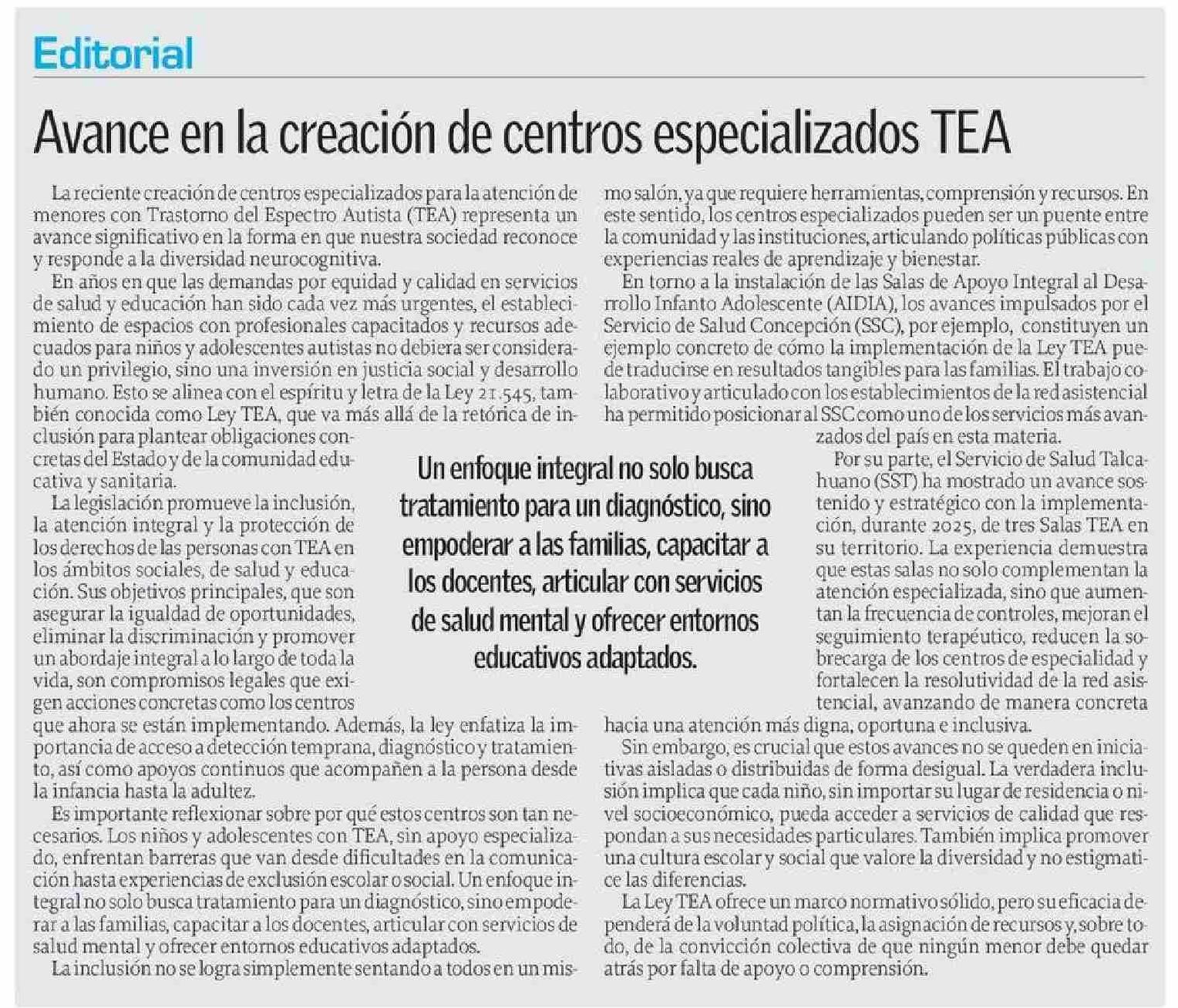 Editorial: Avance en la creación de centros especializados TEA 09-01-2026 El Sur |