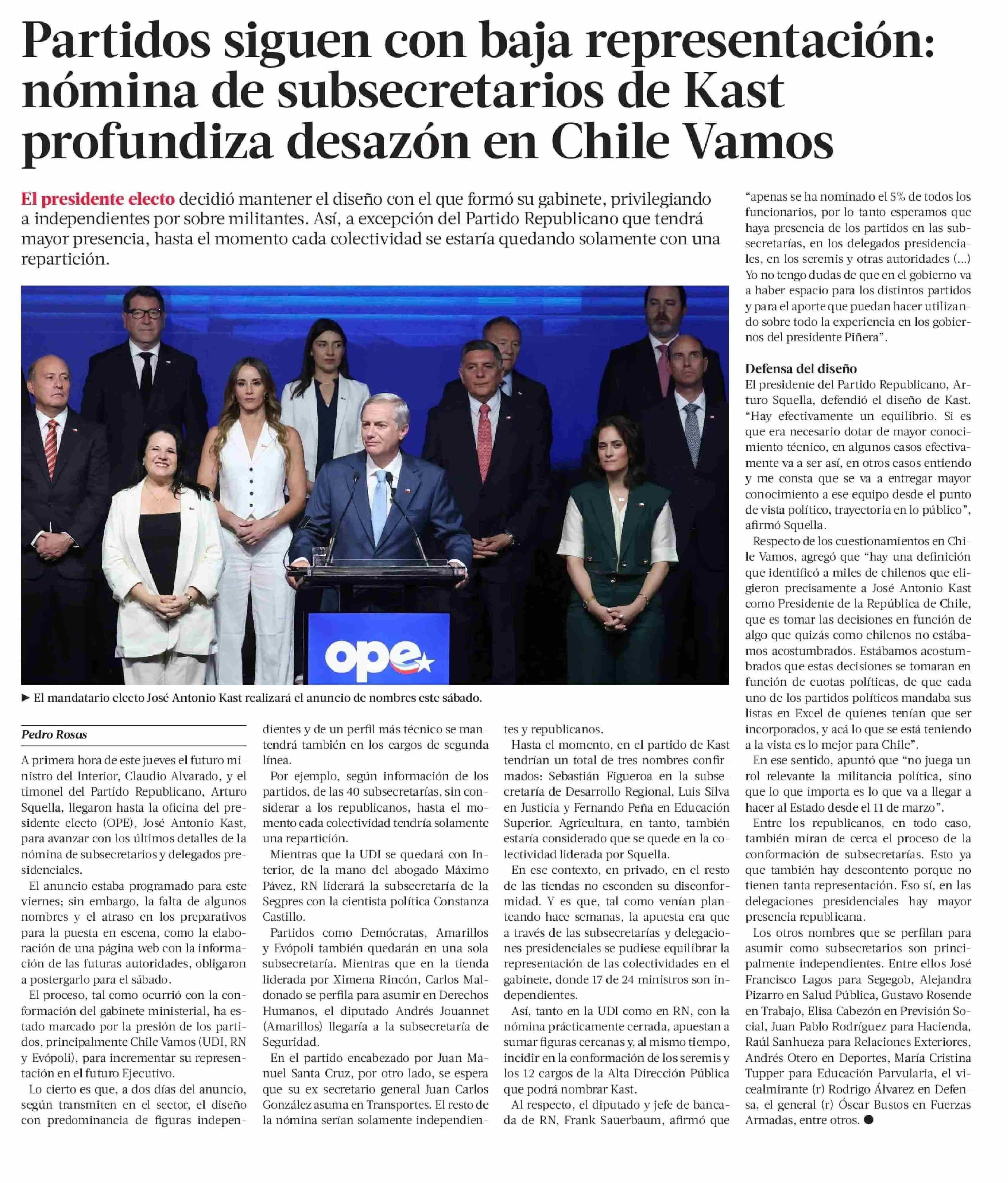 Título: Partidos siguen con baja representación: nómina de subsecretarios de Kast profundiza desazón en Chile Vamos