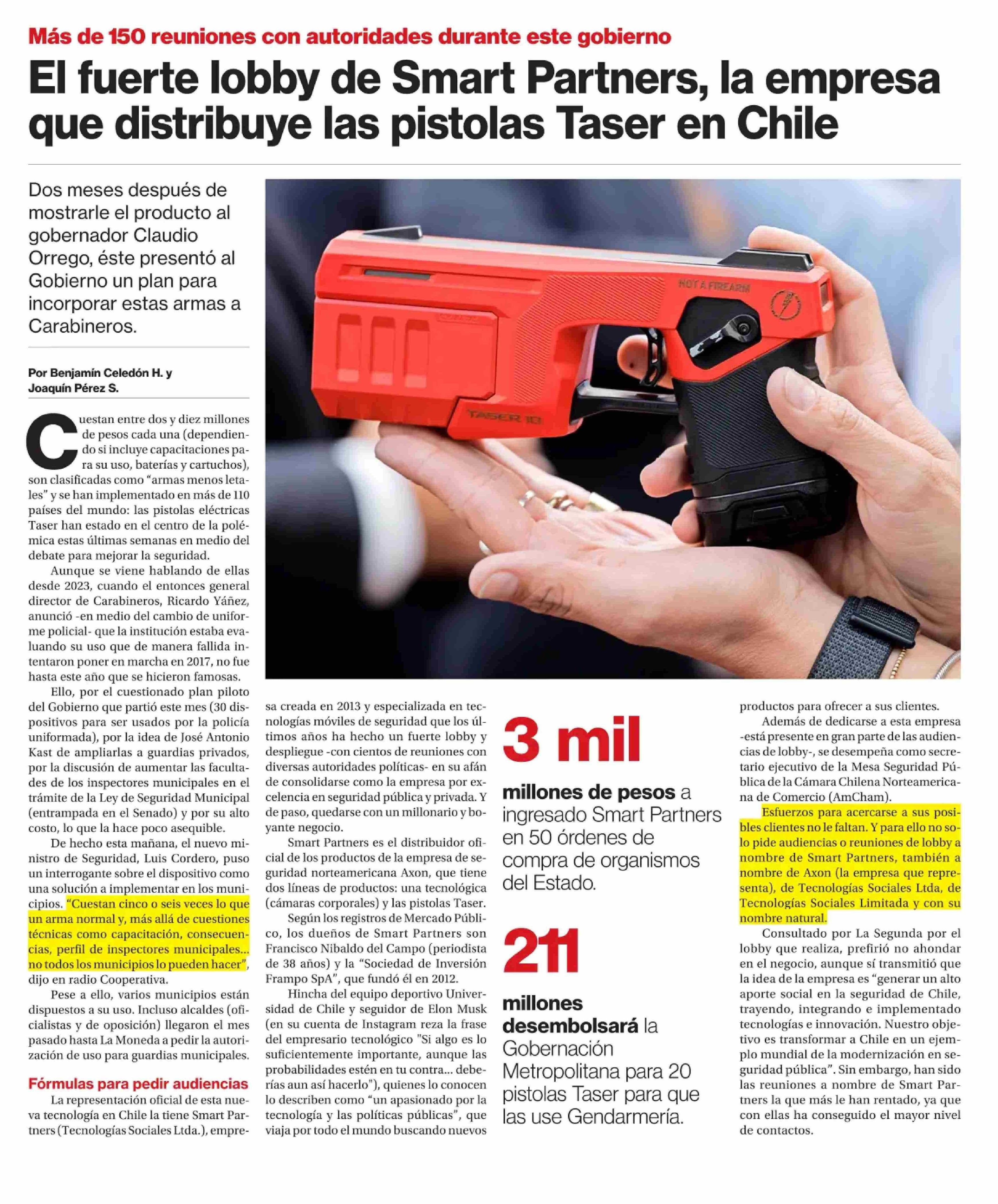 El fuerte lobby de Smart Partners, la empresa que distribuye las pistolas Taser en Chile 28-03-2025 La Segunda |