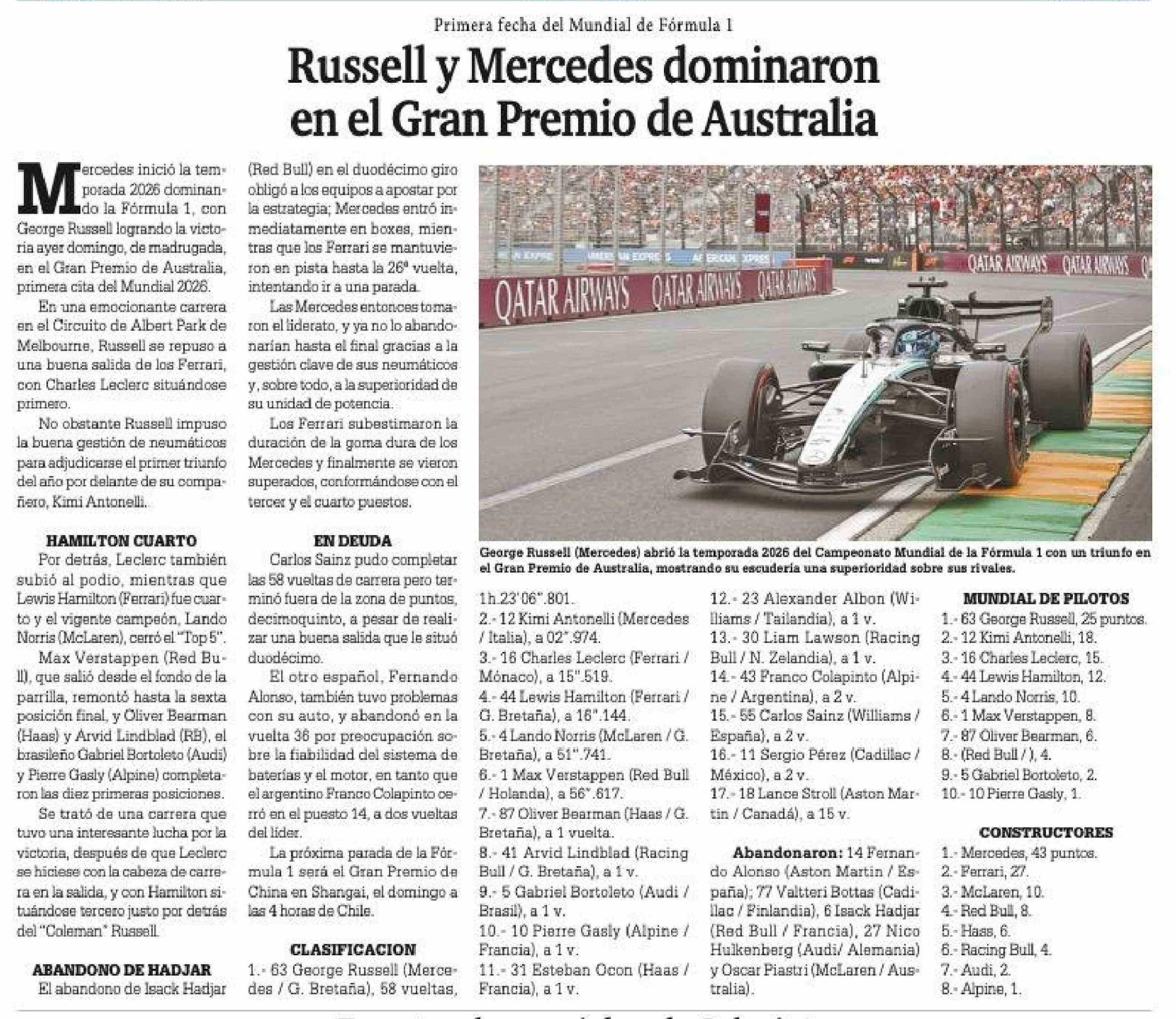 Russell y Mercedes dominaron en el Gran Premio de Australia 09-03-2026 La Prensa Austral |