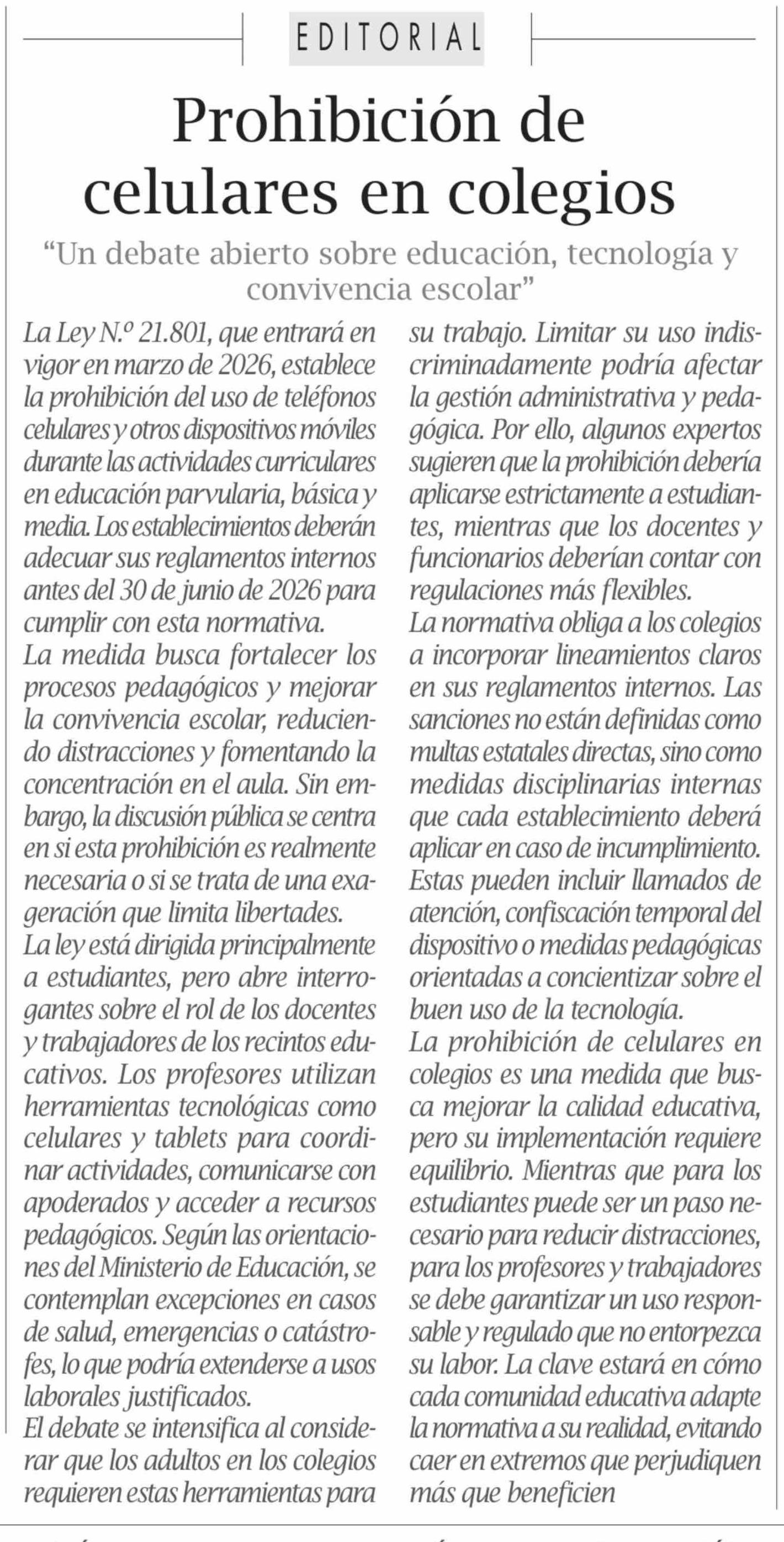 | Título: | Editorial: Prohibición de celulares en colegios |
