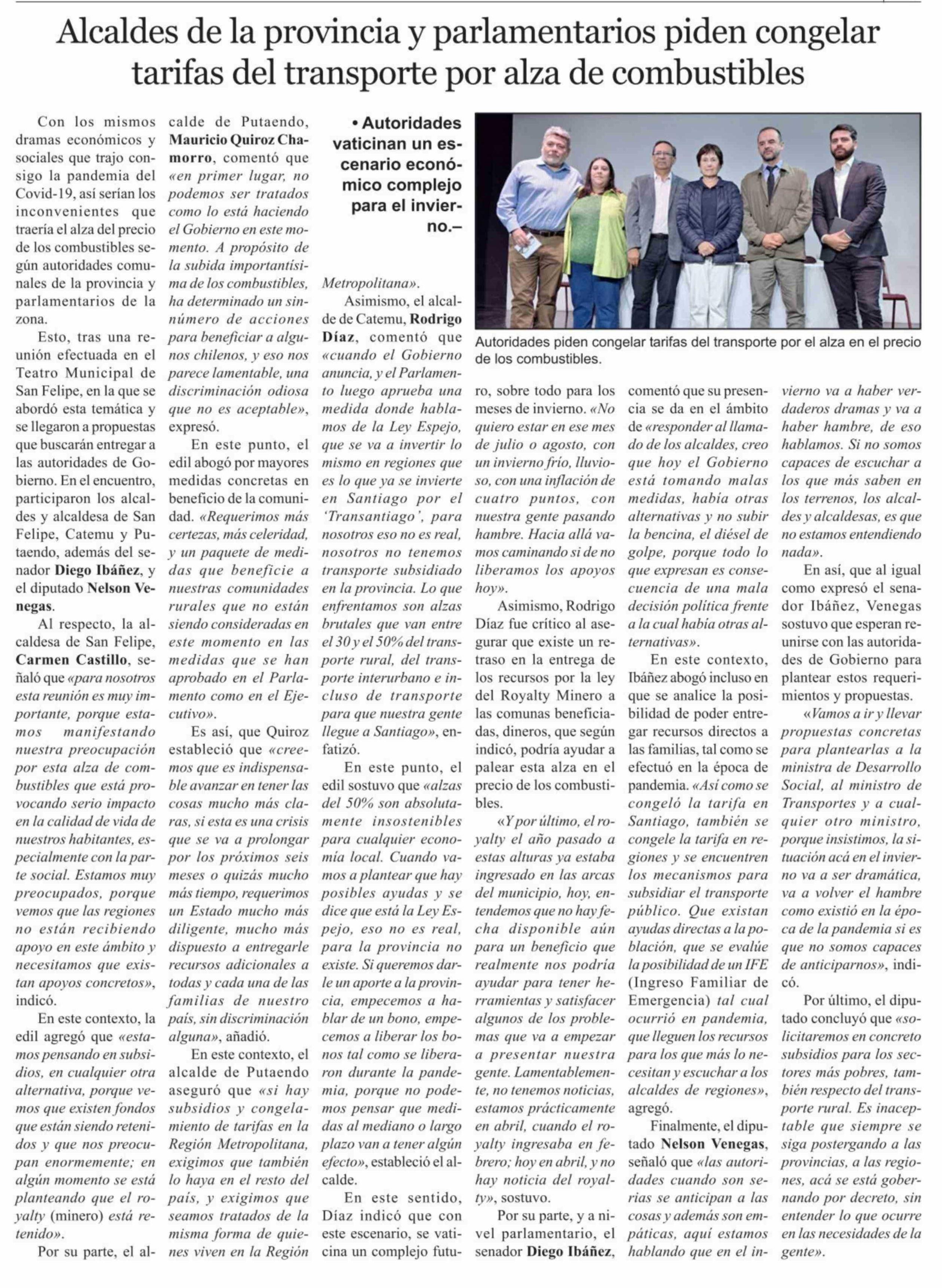 Alcaldes de la provincia y parlamentarios piden congelar tarifas del transporte por alza de combustibles 31-03-2026 El Trabajo |