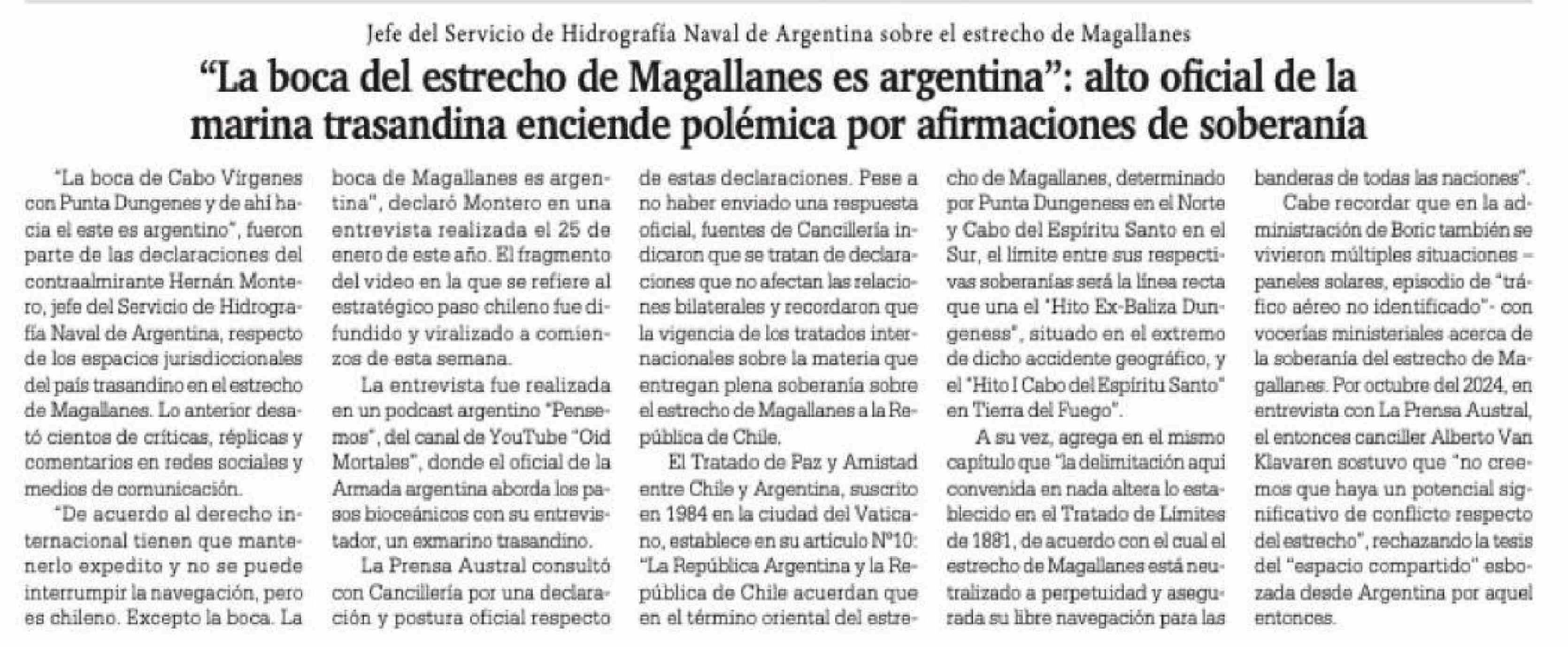 | Título: | "La boca del estrecho de Magallanes es argentina": alto oficial de la marina trasandina enciende polémica por afirmaciones de soberanía |