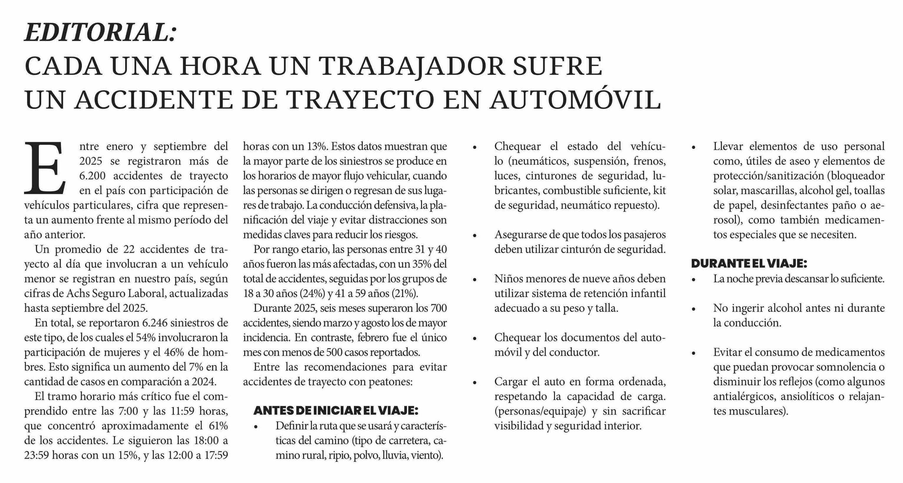 EDITORIAL: CADA UNA HORA UN TRABAJADOR SUFRE UN ACCIDENTE DE TRAYECTO EN AUTOMÓVIL 13-01-2026 Diario Chañarcillo |