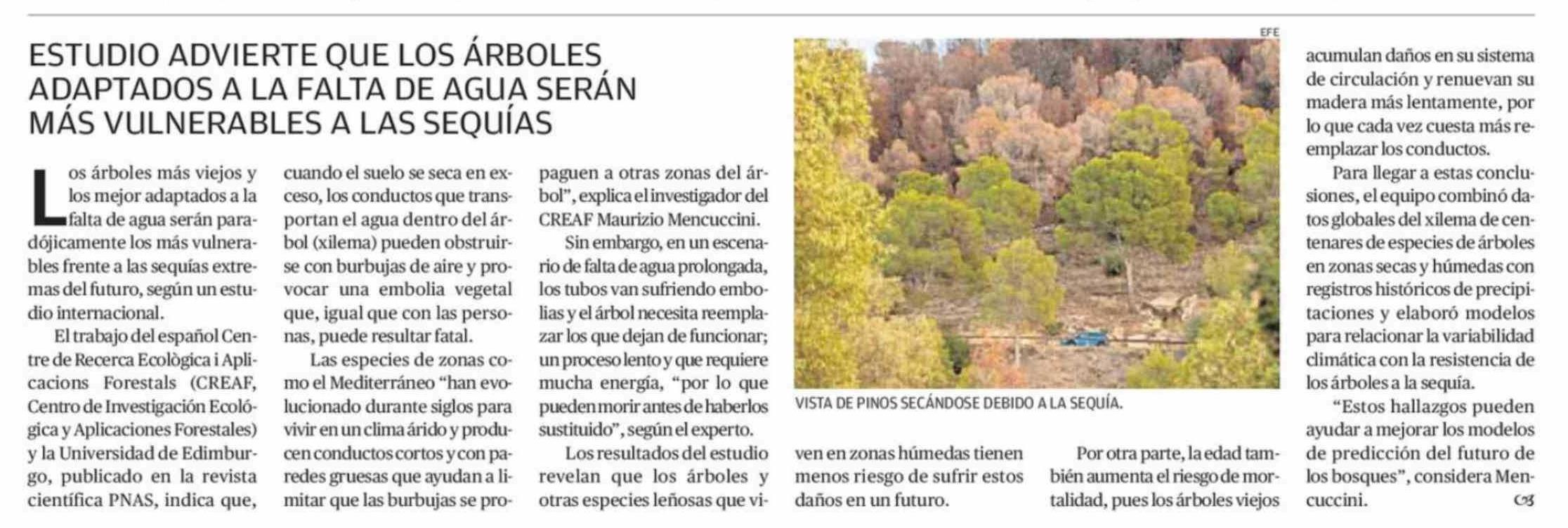 | Título: | ESTUDIO ADVIERTE QUE LOS ÁRBOLES ADAPTADOS ALA FALTA DE AGUA SERÁN MÁS VULNERABLES A LAS SEQUÍAS |