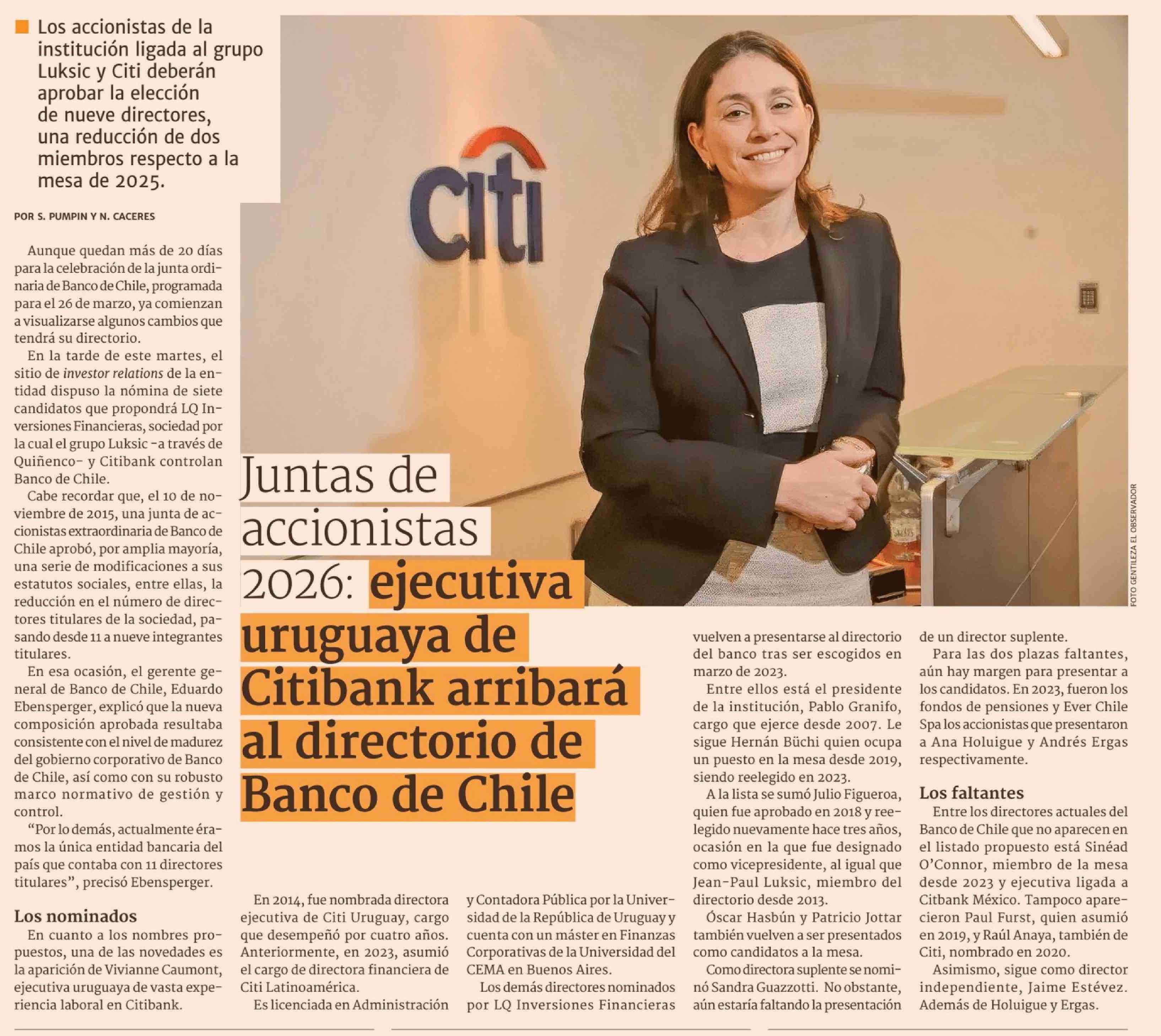 | Título: | Juntas de accionistas 2026: ejecutiva uruguaya de Citibank arribará al directorio de Banco de Chile |