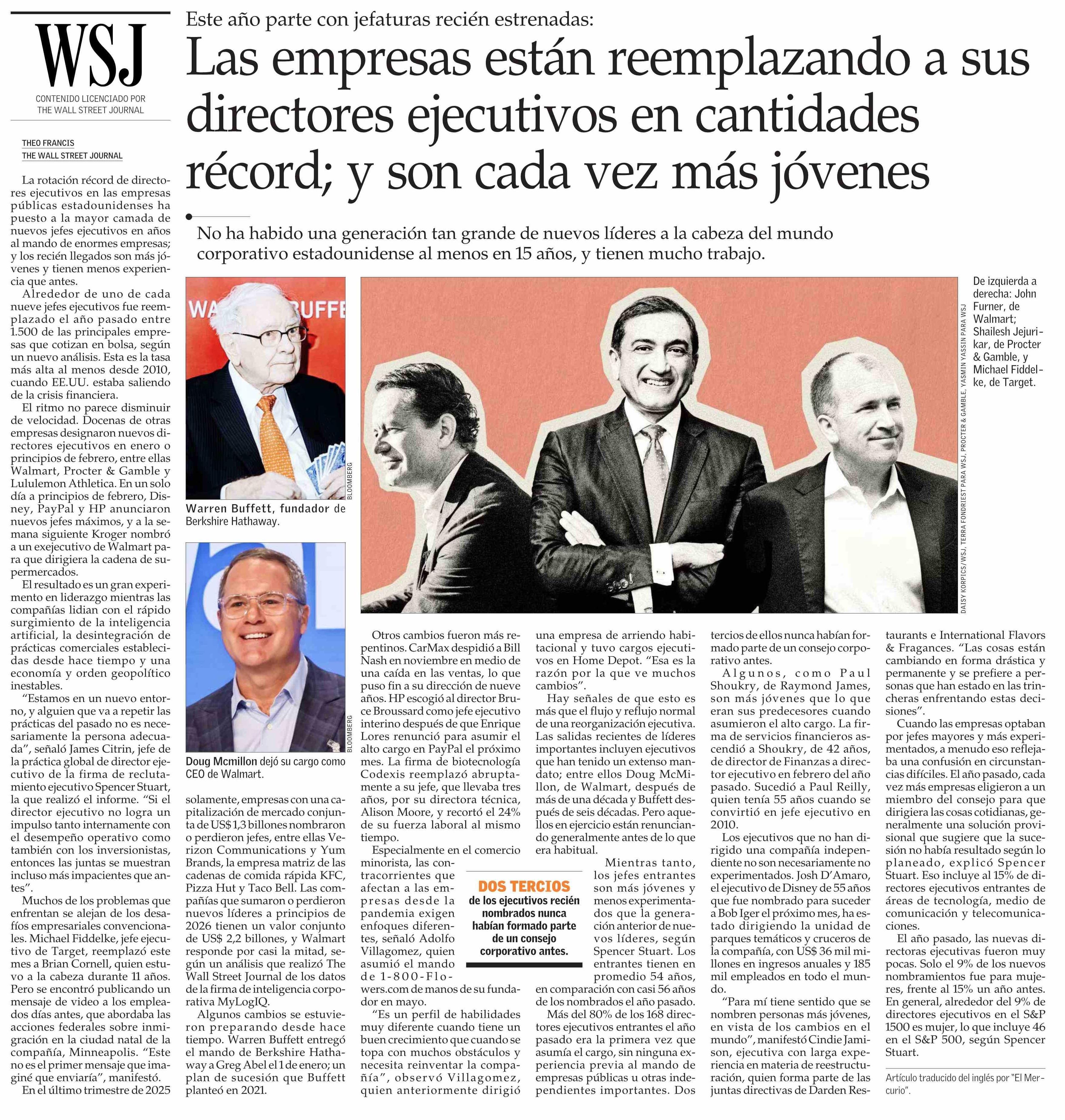 Las empresas están reemplazando a sus directores ejecutivos en cantidades récord; y son cada vez más jóvenes 27-02-2026 El Mercurio |
