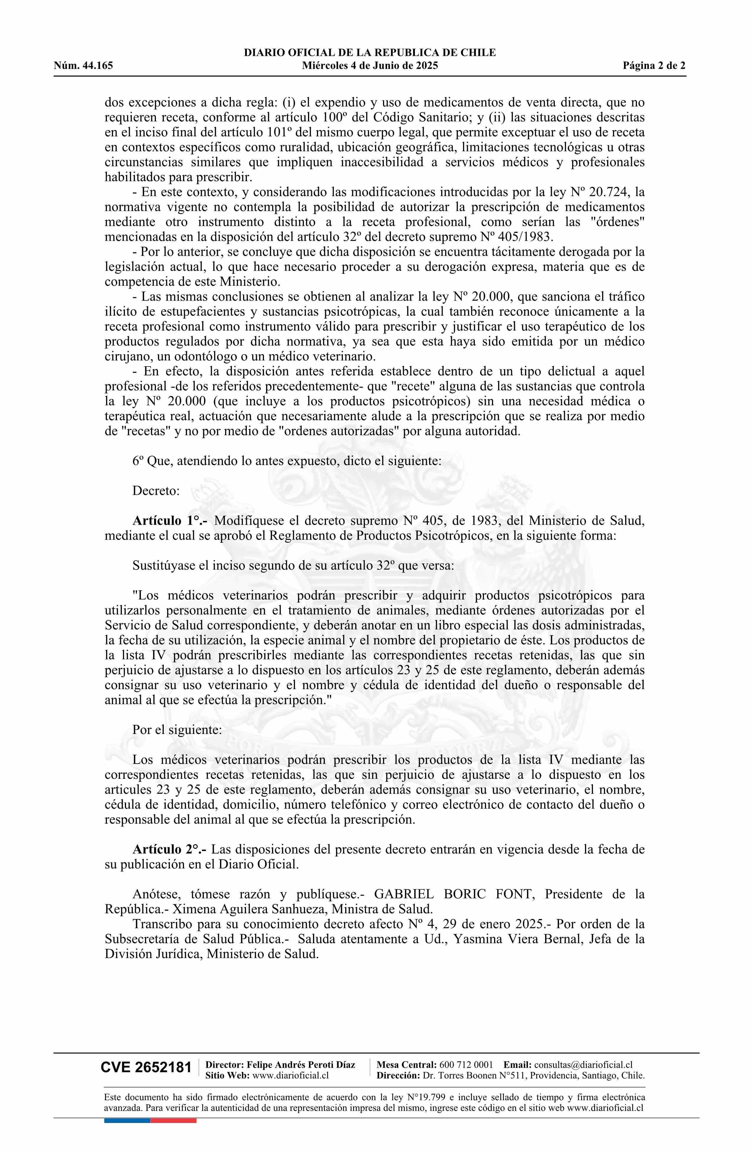 | Título: | Decreto número 4, de 2025.- Modifica decreto Nº 405, de 1983, que aprueba el Reglamento de Productos Psicotrópicos |