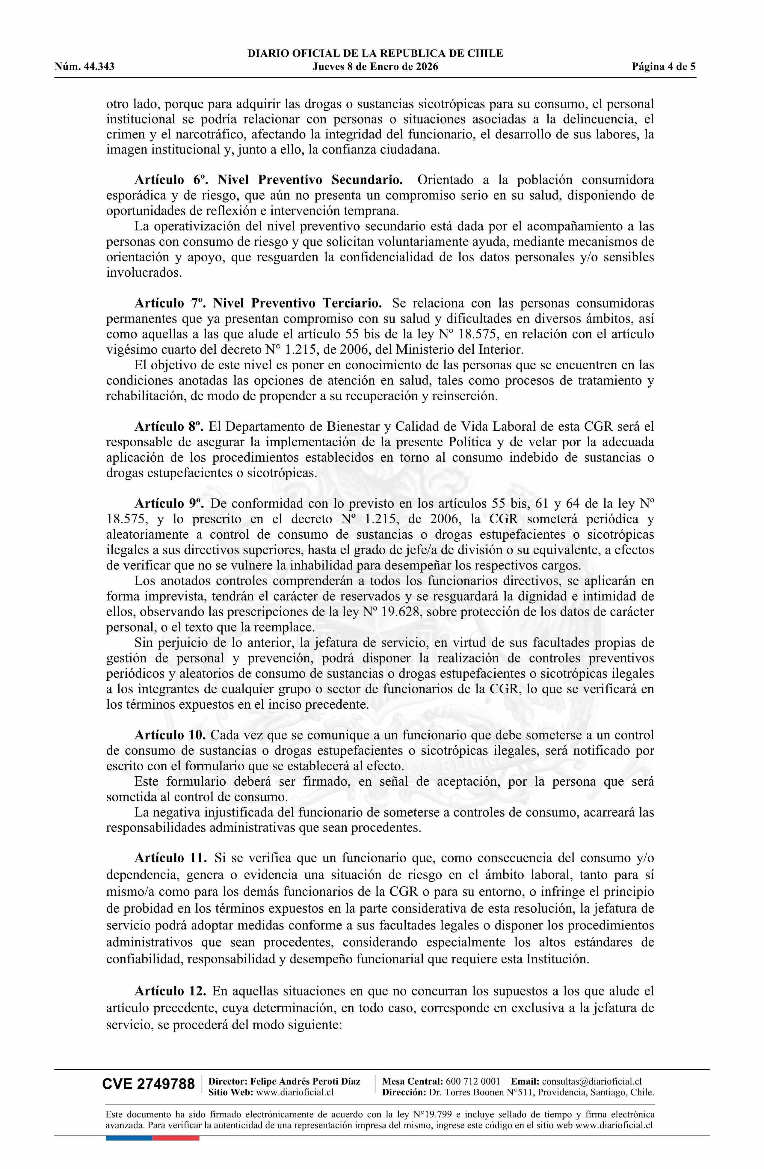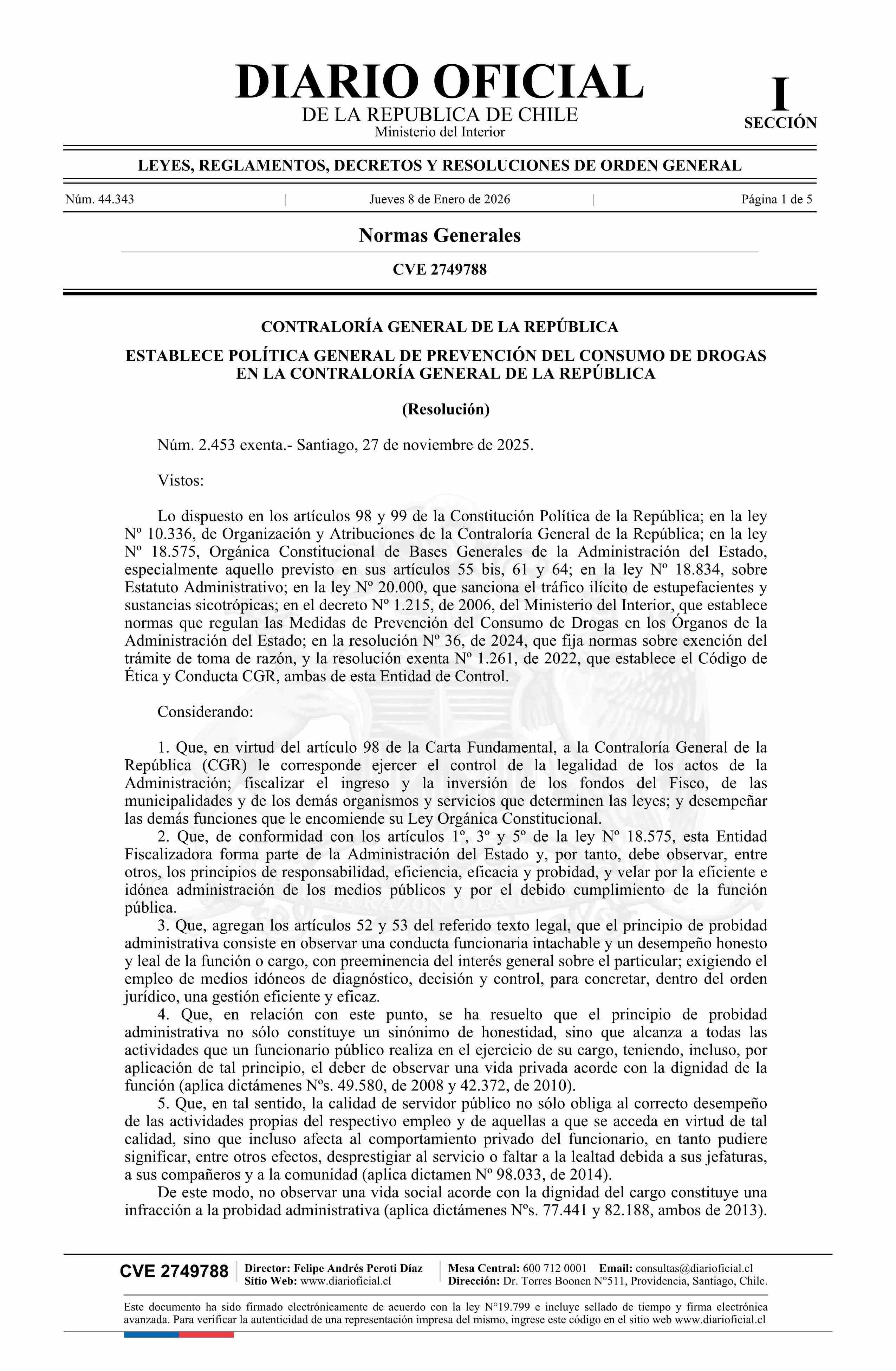 Resolución exenta número 2.453, de 2025.- Establece política general de prevención del consumo de drogas en la Contraloría General de la República 08-01-2026 DIARIO OFICIAL CHILE - BOLETÍN OFICIAL DE MINERÍA |