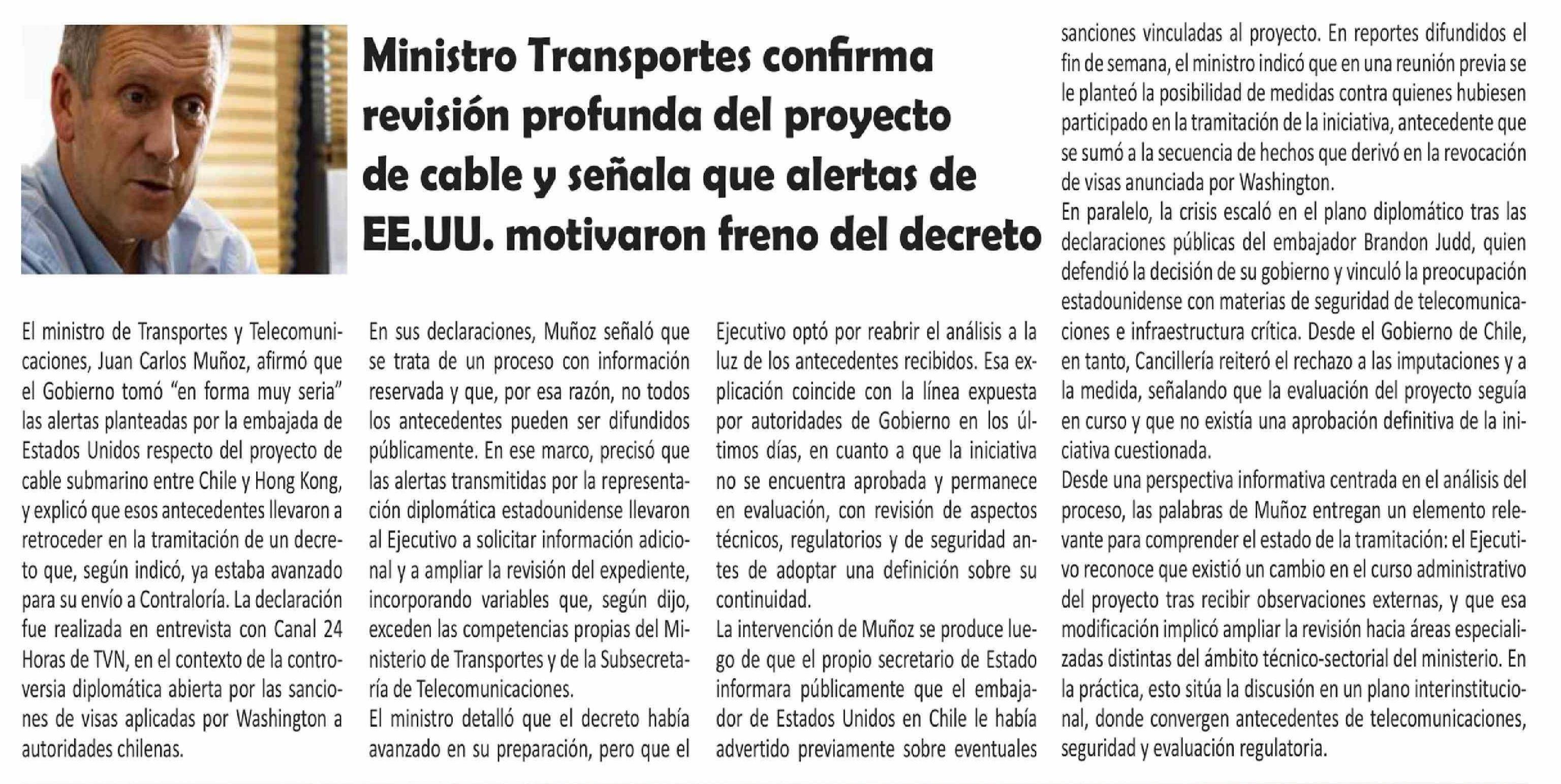 | Título: | Ministro Transportes confirma revisión profunda del proyecto de cable y señala que alertas de EE.UU. motivaron freno del decreto |