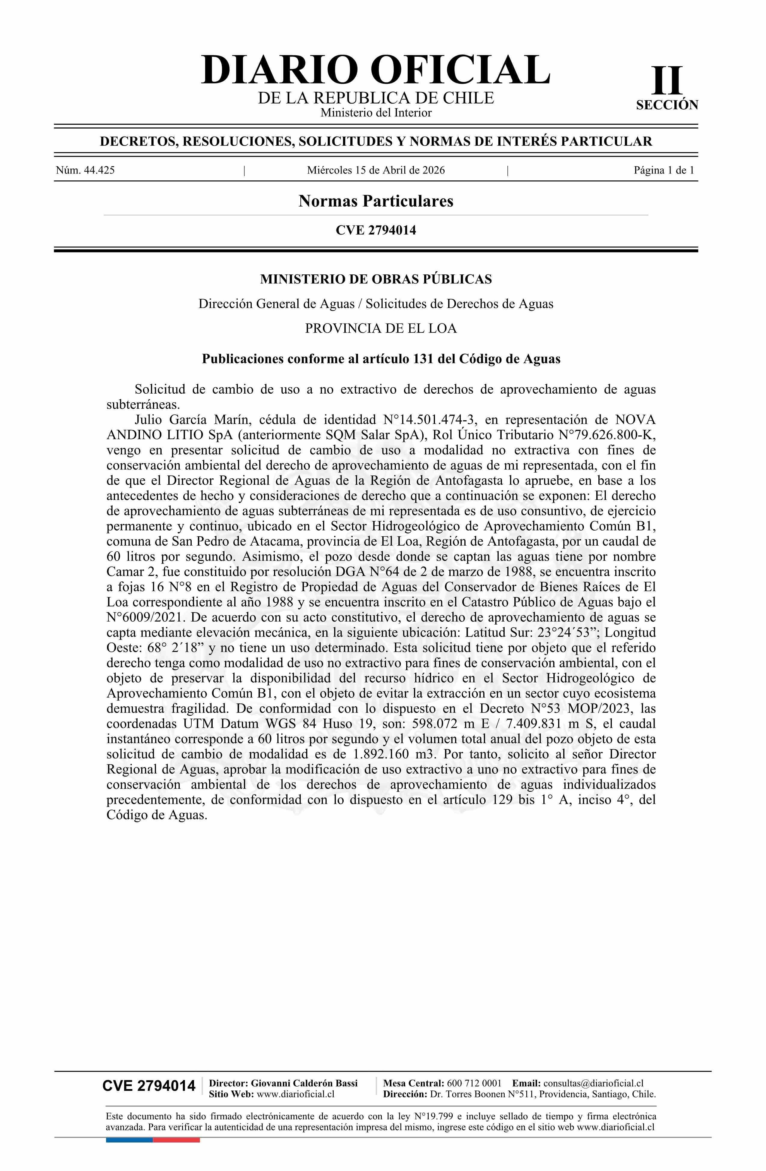 Solicitud Nova Andino Litio SpA 15-04-2026 Diario Oficial Edición Electrónica |