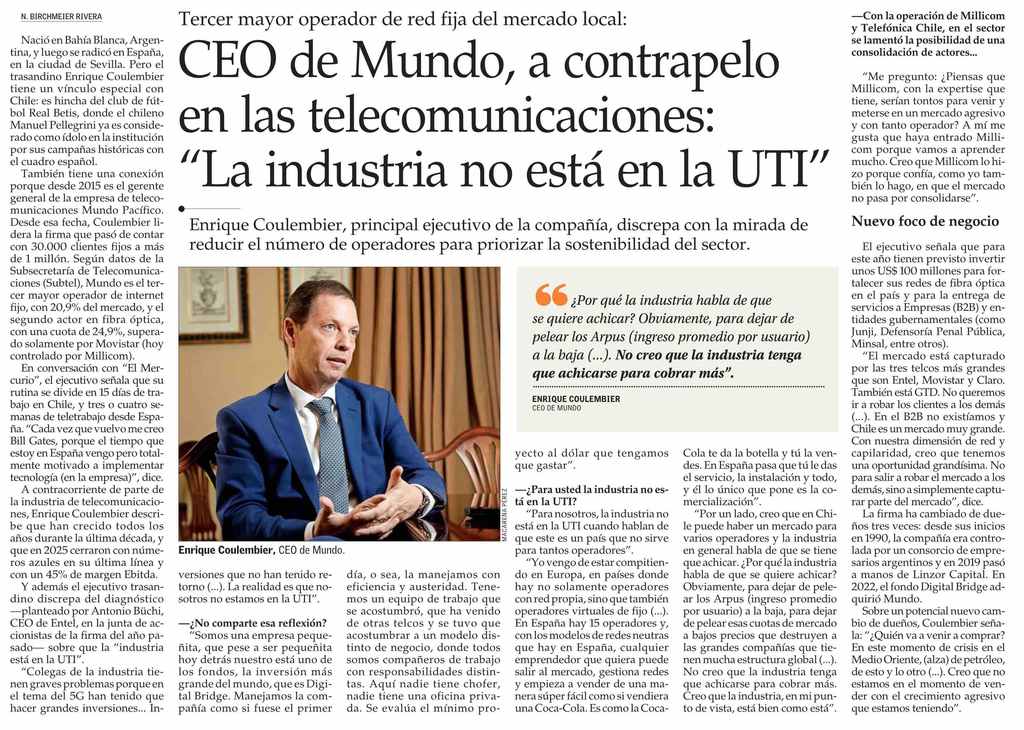 Título: CEO de Mundo, a contrapelo en las telecomunicaciones: “La industria no está en la UTI”