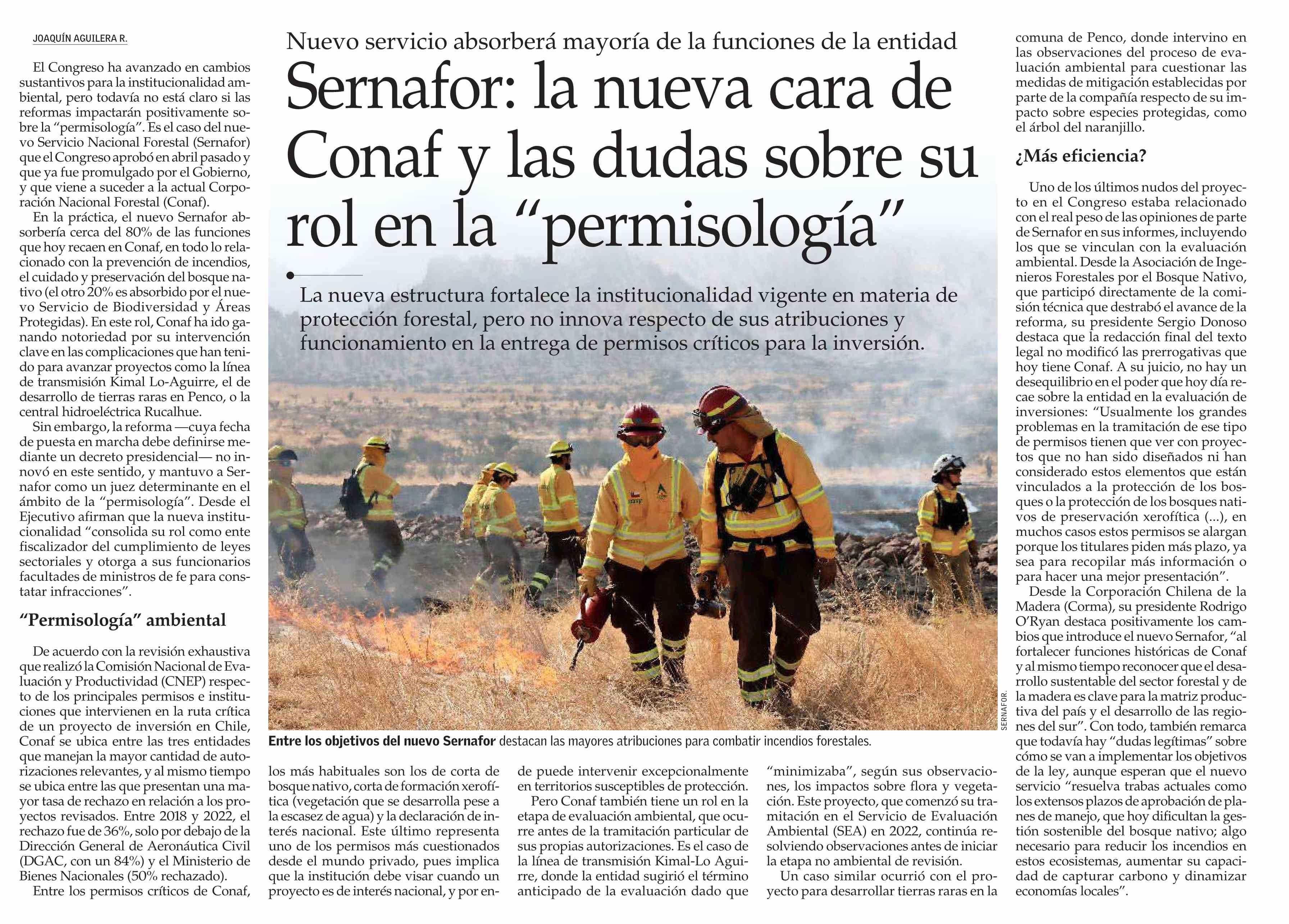 Sernafor: la nueva cara de Conaf y las dudas sobre su rol en la "permisología" 26-05-2025 El Mercurio |