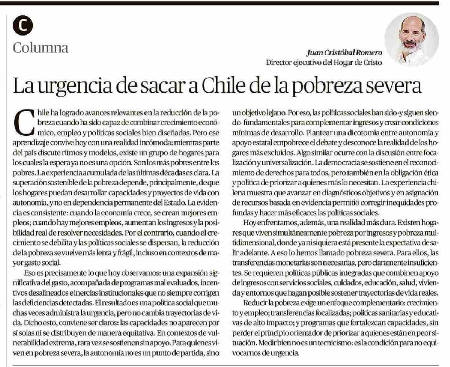 Columnas de Opinión: La urgencia de sacar a Chile de la pobreza severa 09-01-2026 El Mercurio de Valparaíso |