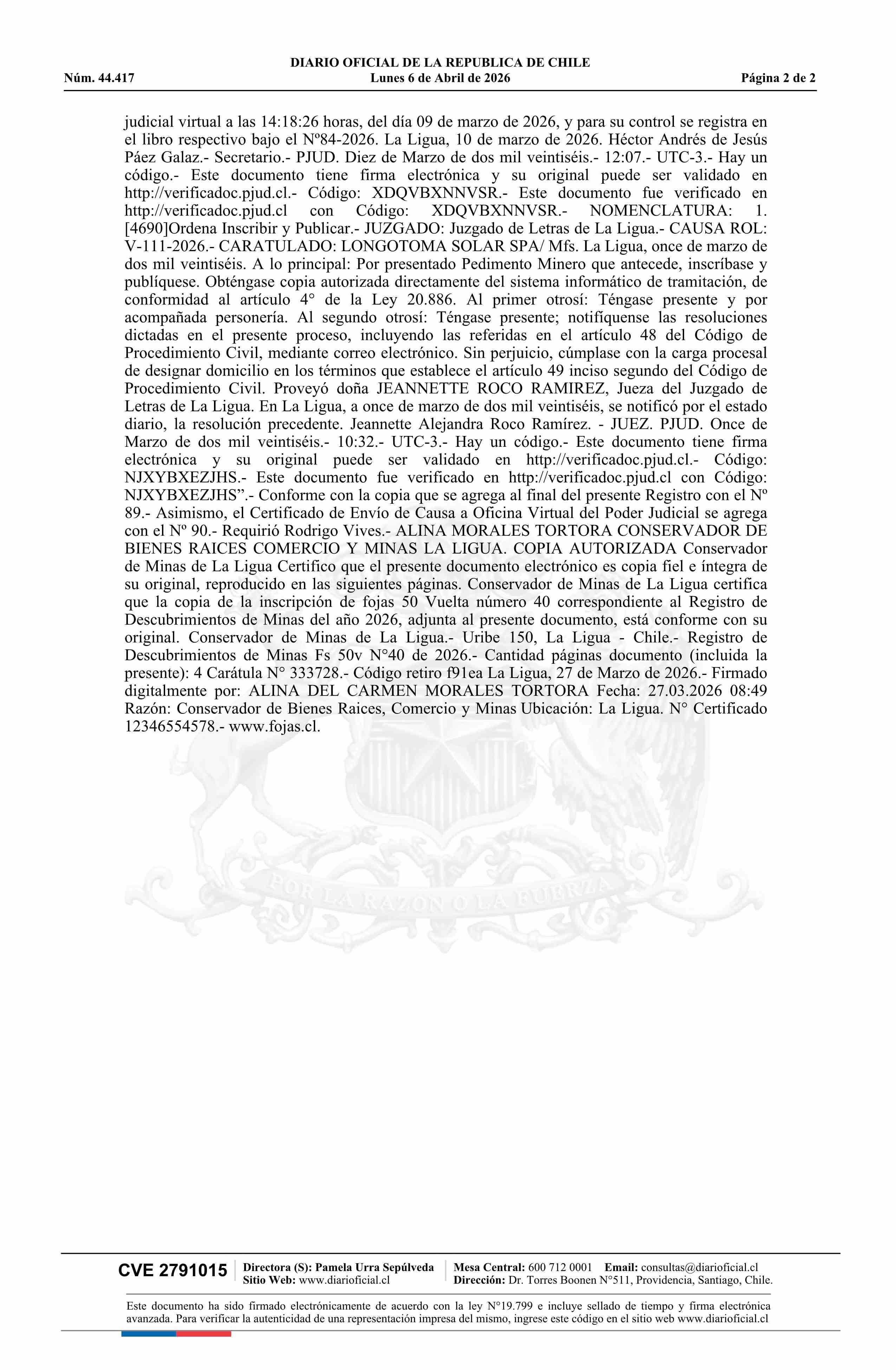 LONGOTOMA II 2 / Longotoma Solar SpA 06-04-2026 DIARIO OFICIAL CHILE - BOLETÍN OFICIAL DE MINERÍA |