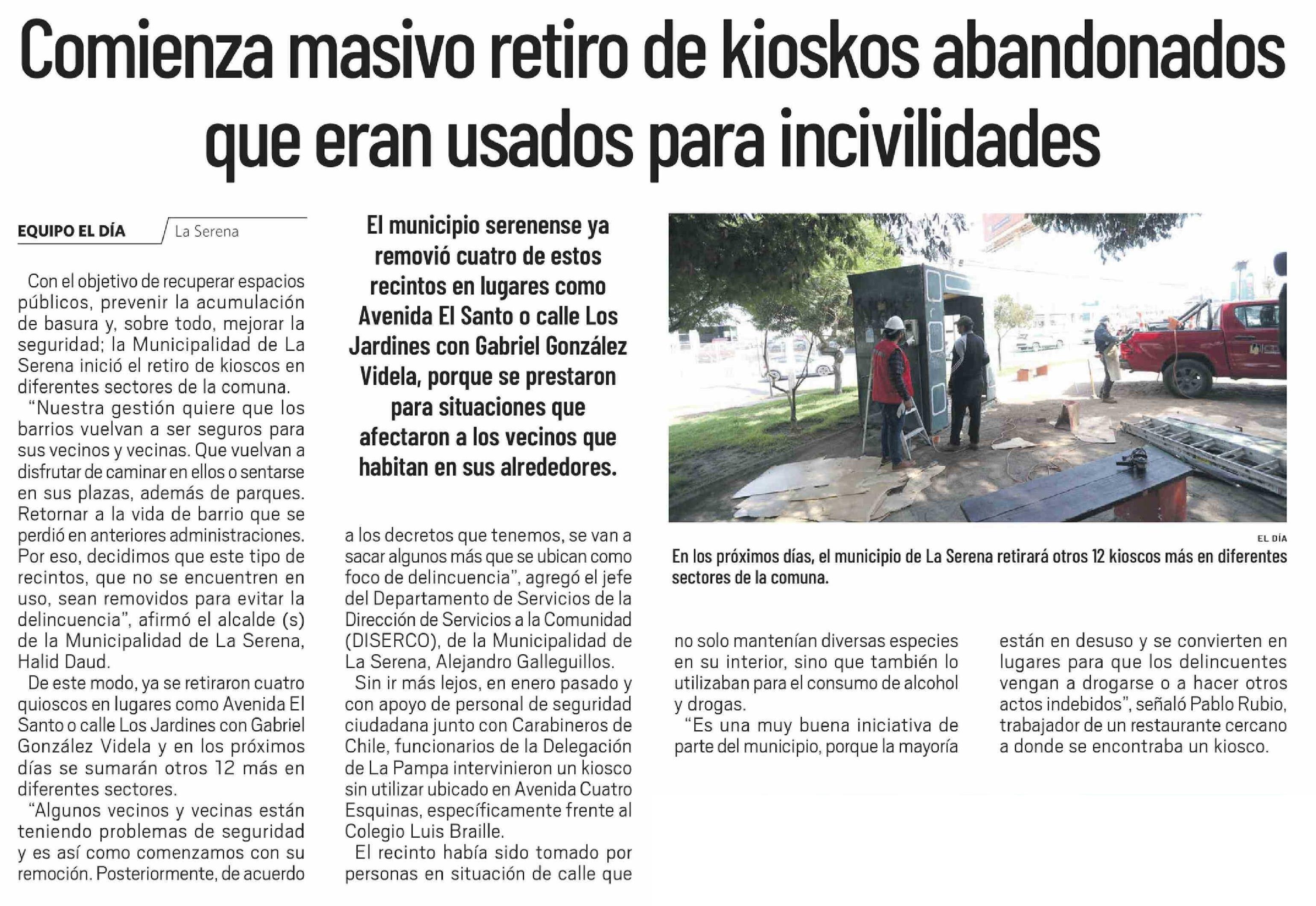 Comienza masivo retiro de kioskos abandonados que eran usados para incivilidades 25-02-2026 El Día |