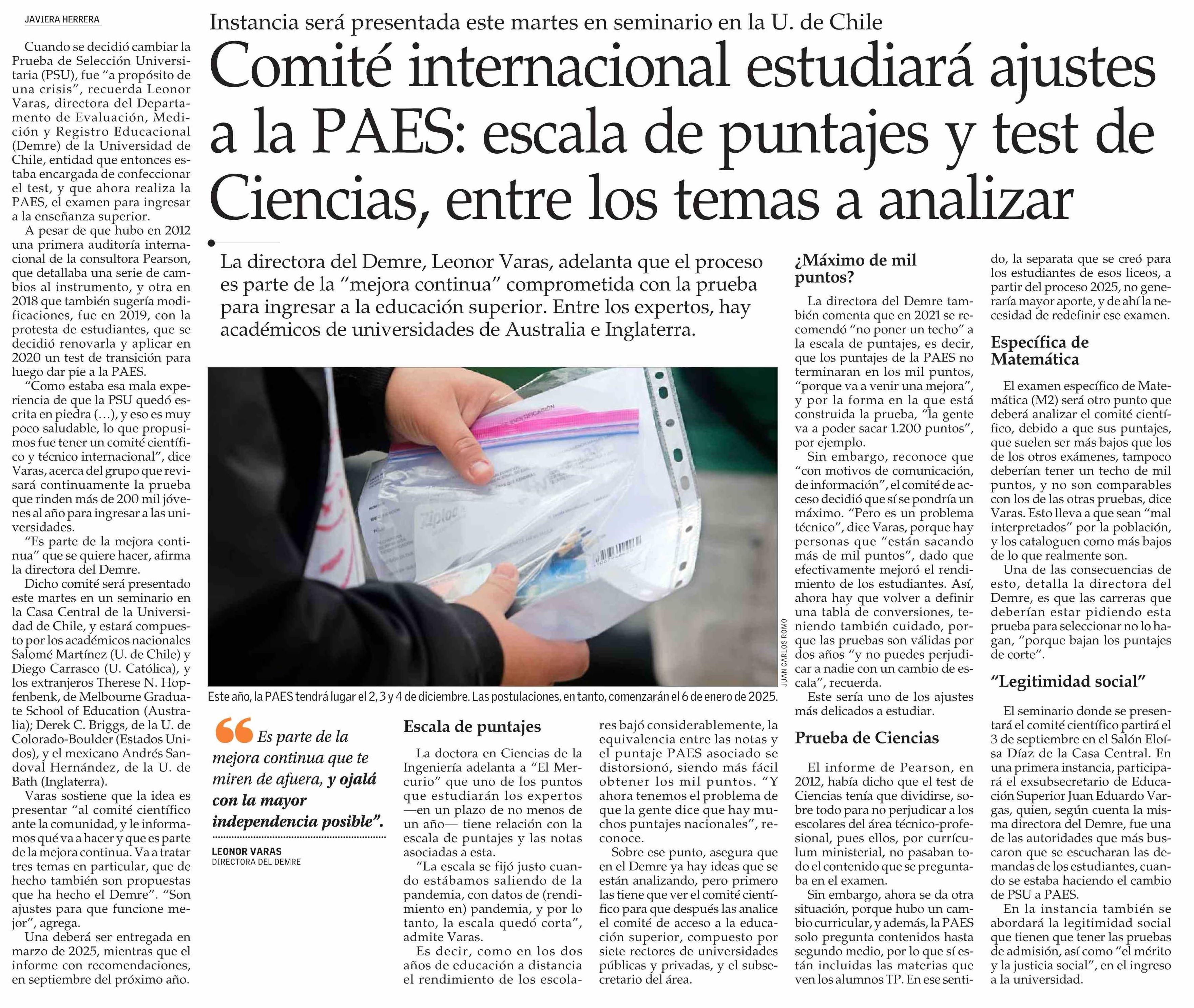 Comité internacional estudiará ajustes a la PAES: escala de puntajes y test de Ciencias, entre los temas a analizar 02-09-2024 El Mercurio |
